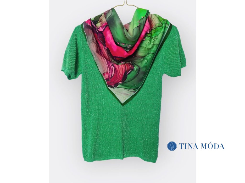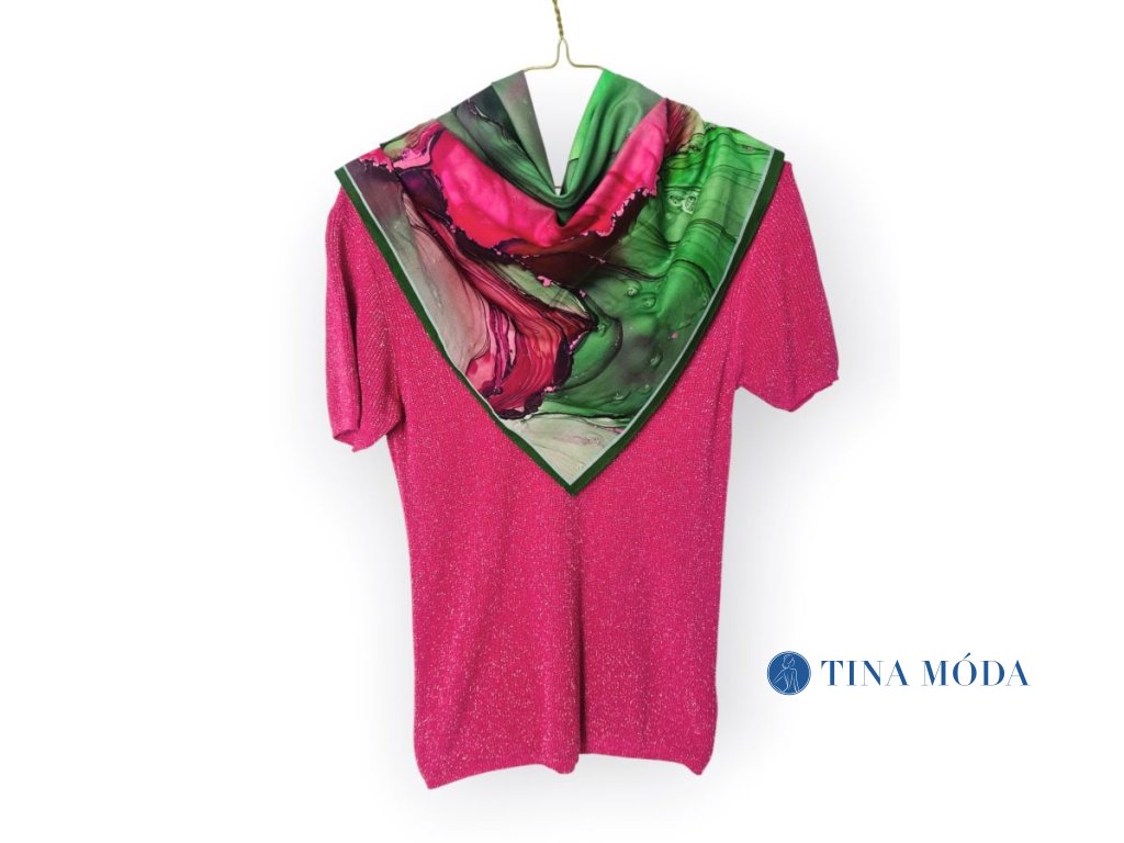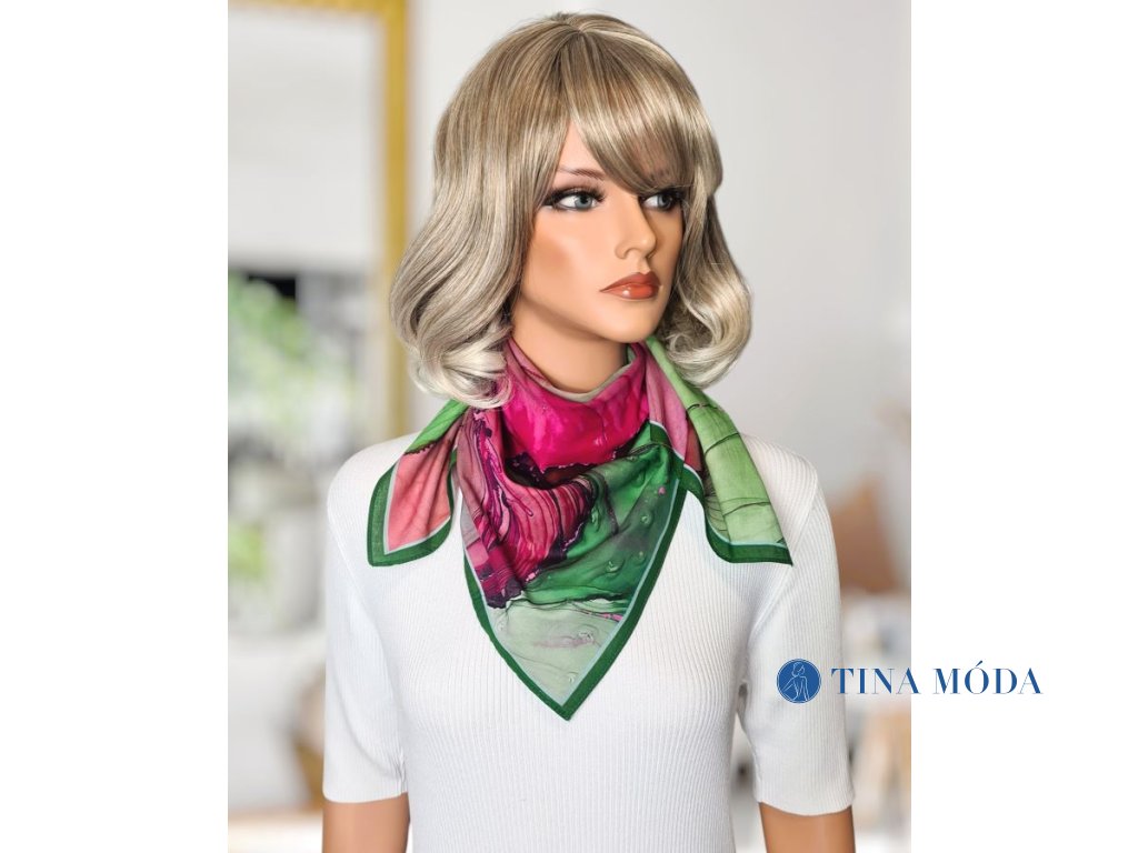 Krásná kombinace kontrastu a veselých barev, které rozzáří váš vzhled. Šátek můžete kombinovat k riflové bundě i saku, jeho veselé barvy krásně vyniknou v letním slunci. Vázat můžete dle fantazie. Přírodní materiál je na kůži velice příjemný. Praní viz. etiketa údržby.