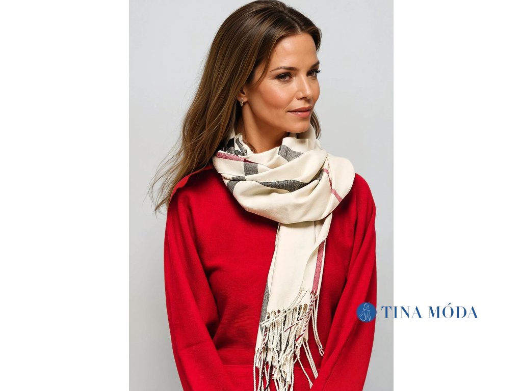 Jemná a měkká světlá šála s decentním vzorem v černé a červené barvě v bodobě linek a tvoří nepravidelný kostkovaný vzor. Kašmírovou šálu využijete na denní nošení ke kabátu i bundě na procházky ve dvou nebo se psem. Oviňte se hřejivostí vlny a už vám nebude foukat na krk. Materiál je příjemný na kůži, měkký - nekouše. Praní viz. etiketa údržby.