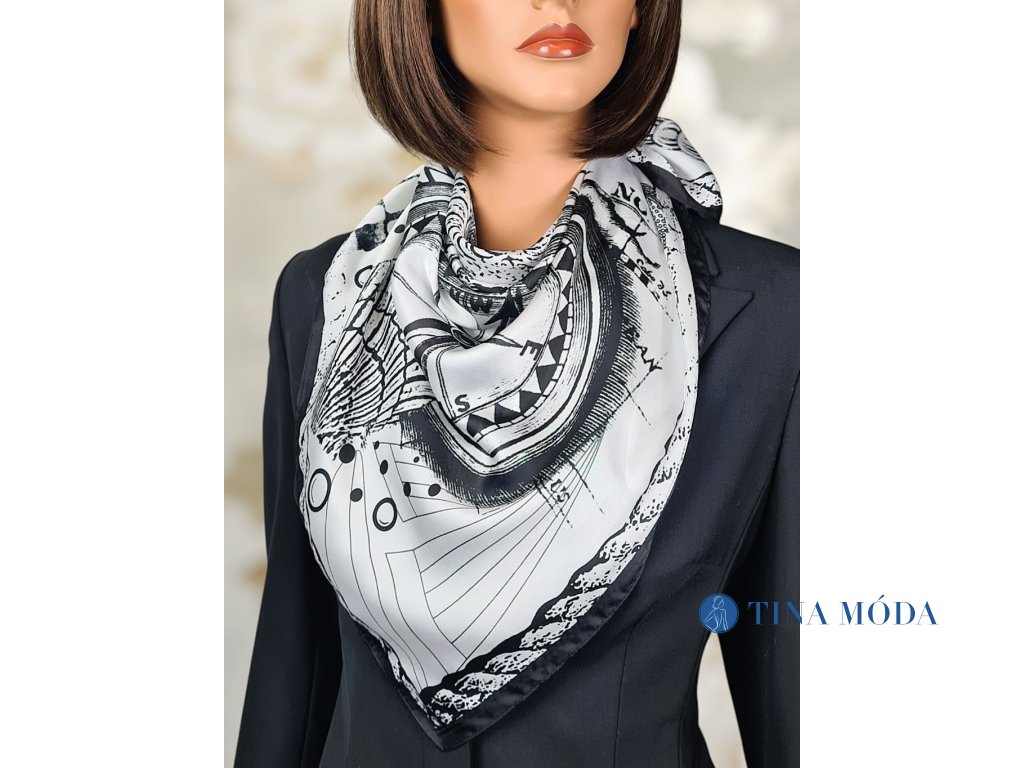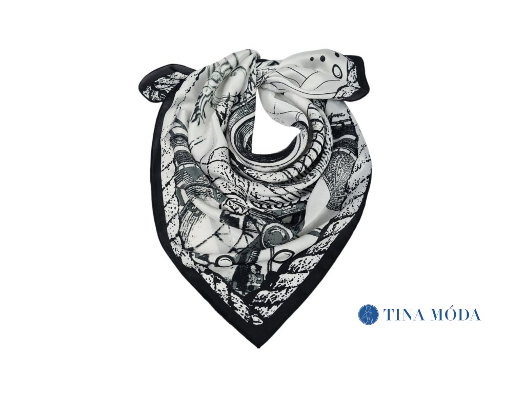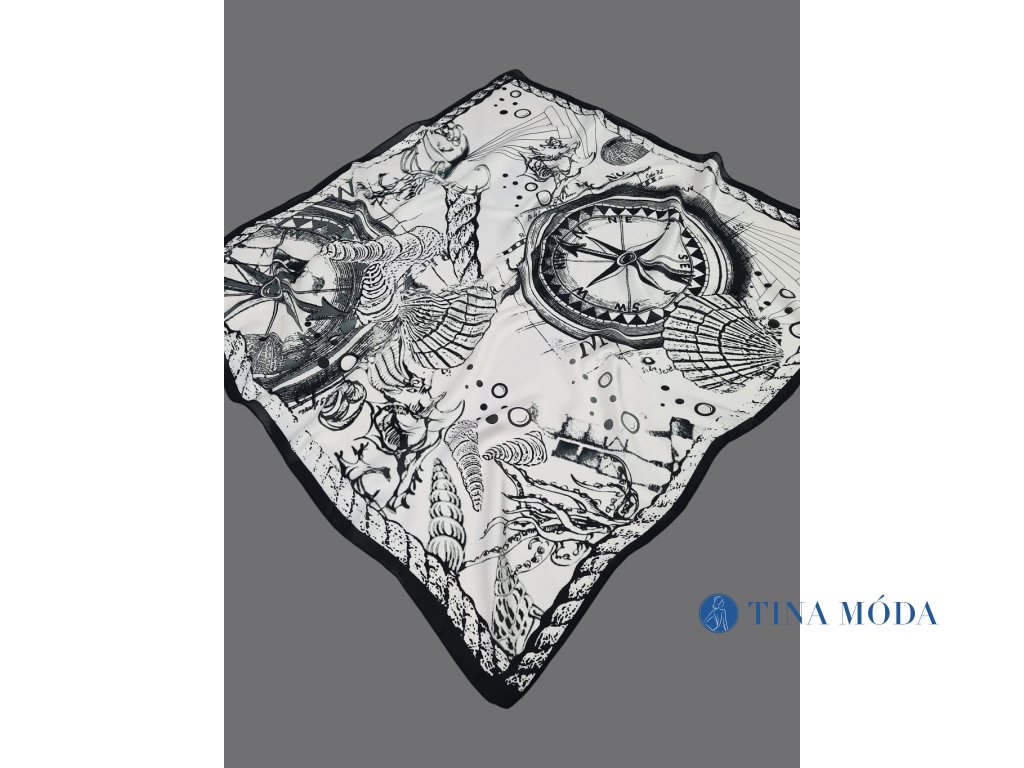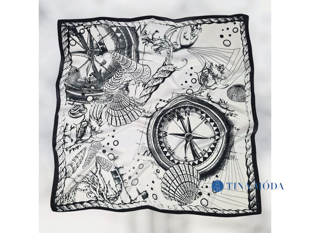 Krásná kombinace kontrastu barev a letním tématem moře, jako jsou mušle, škeble a kompas, který vám třeba najde cestu ... Šátek můžete kombinovat k šatům, riflové bundě i saku, nejen k business outfitu, ale i ležernímu stylu ... fantazii se meze nekladou. Materiál je na kůži velice příjemný. Praní viz. etiketa údržby.