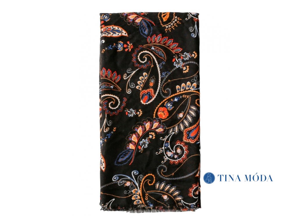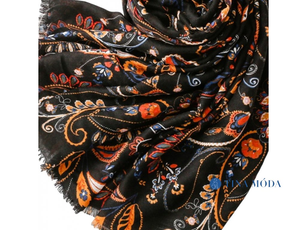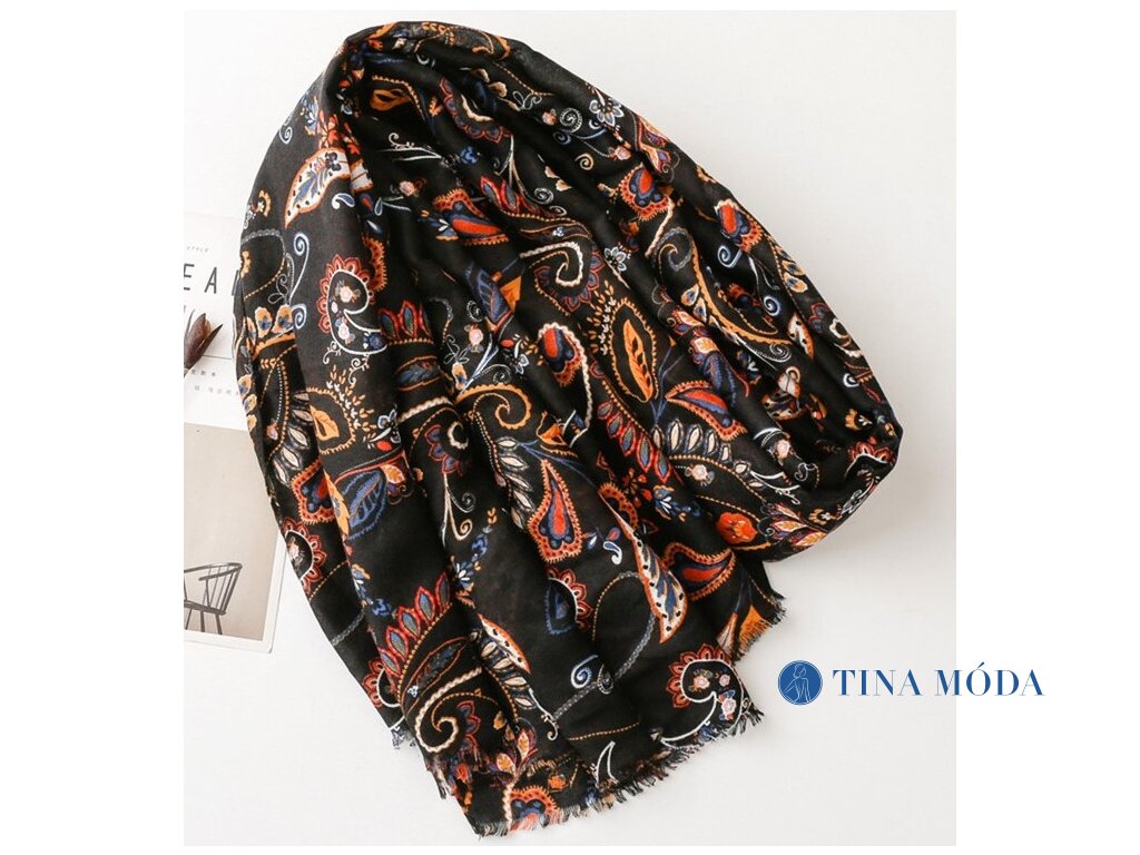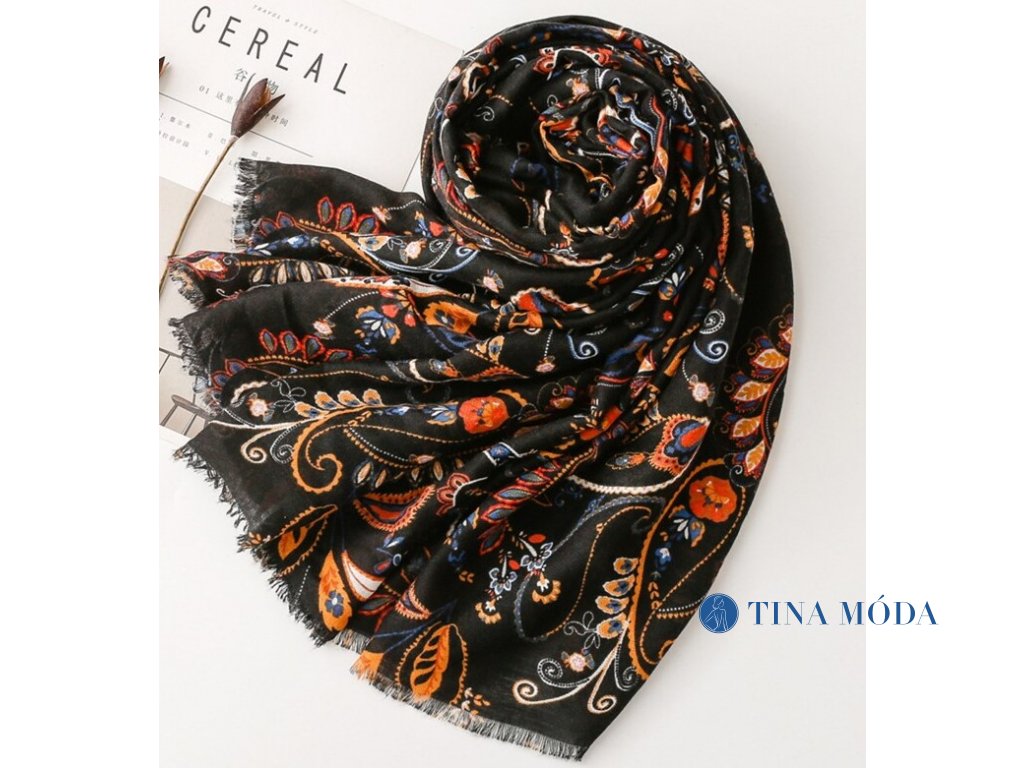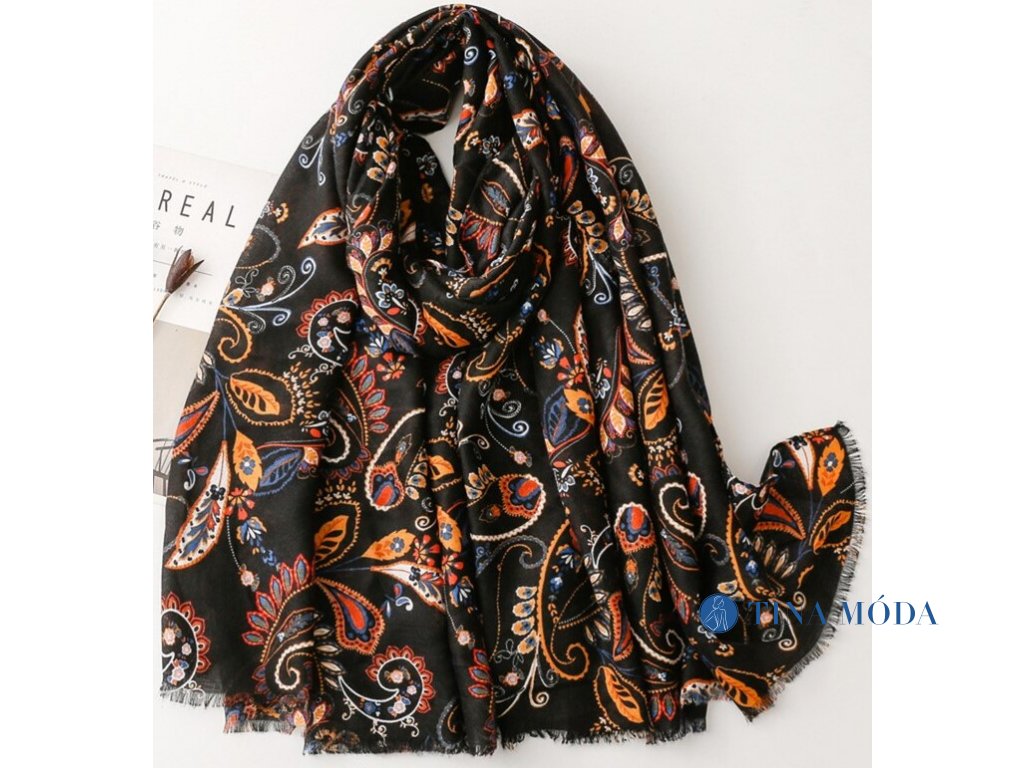 Černá šála květovaná, vzor paisley našich babiček, bavlněná s viskózou, pléd přes ramena