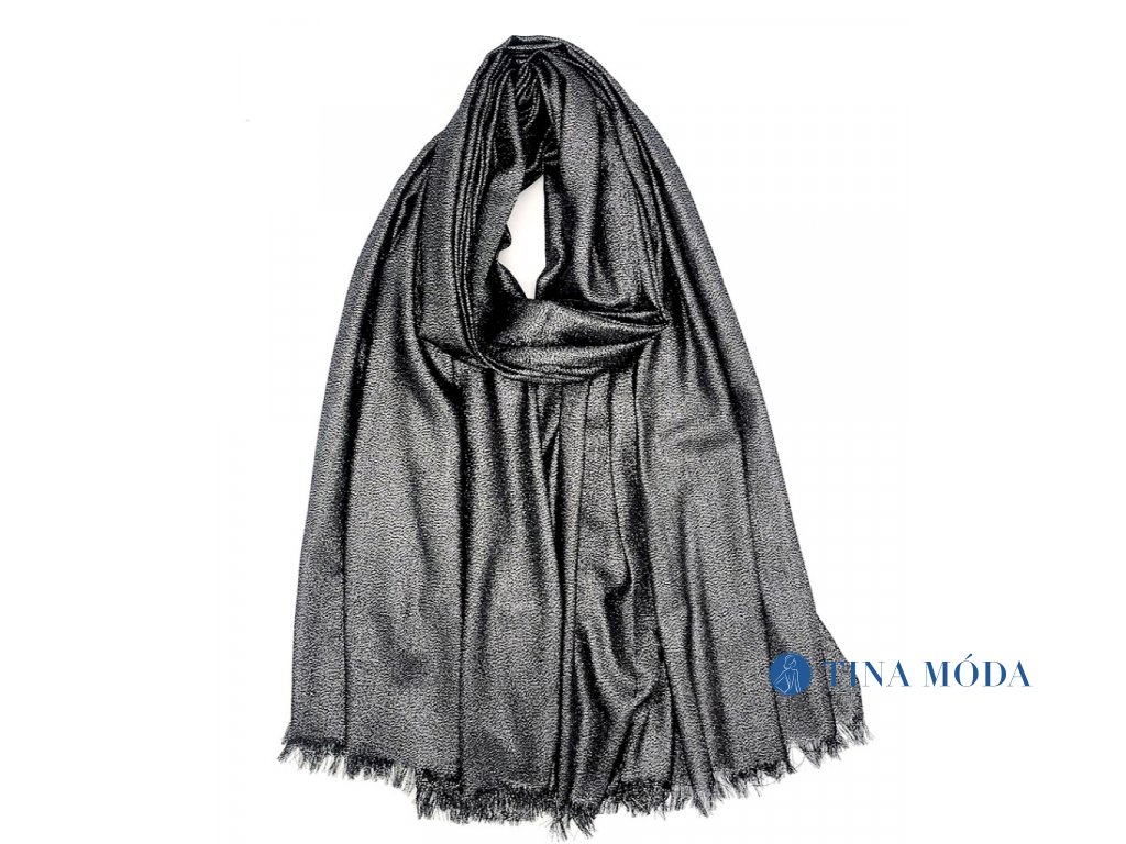 Černo stříbrná šála se třpytivým efektem a třásněmi. Přehoz přes ramena na šaty na letní párty, šála na svatbu a ostatní slavnostní příležitosti, nejen tam i na denní nošení. Šálu můžete nakombinovat k šatům, kabátu i přes plavky. Lehce uvázat kolem krku, nosit jako pléd, pareo nebo přehoz přes ramena na šaty... libovolně. Materiál je příjemný na kůži. Praní viz. etiketa údržby.