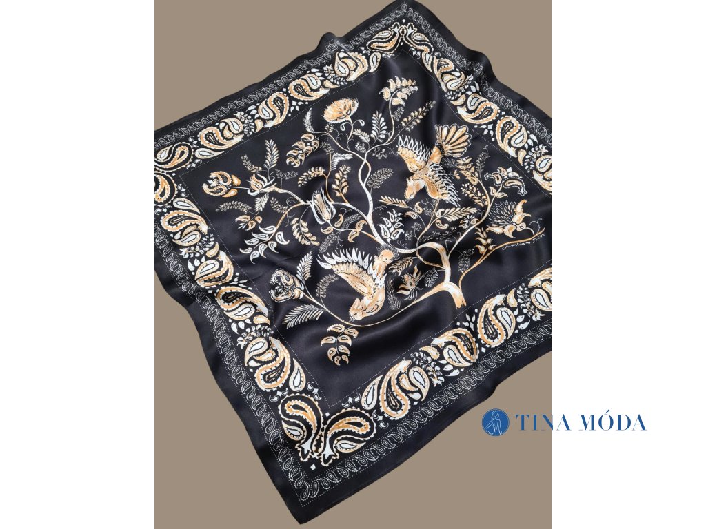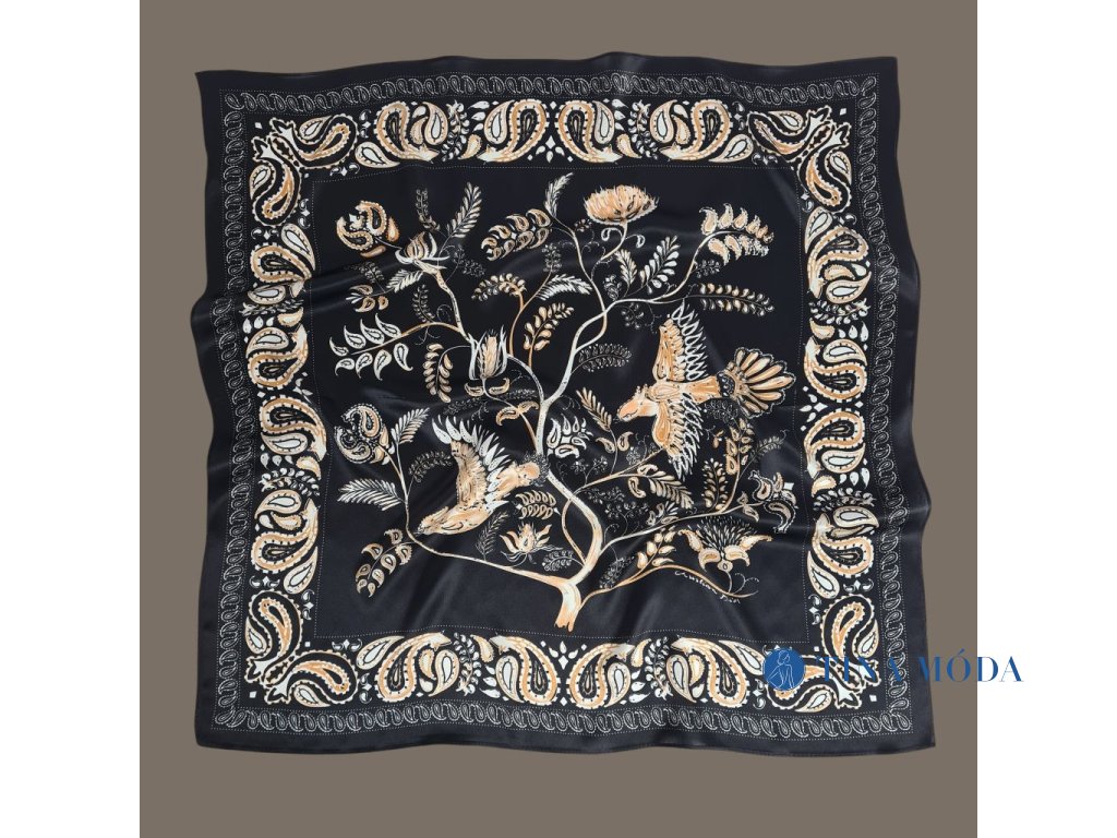 Černý hedvábný šátek se vzorem paisley, ptáčky a stromem 70 cm