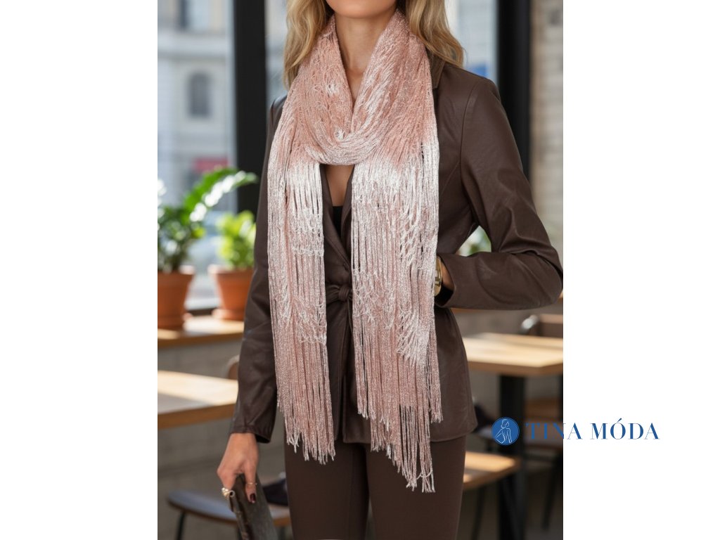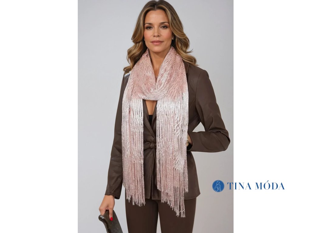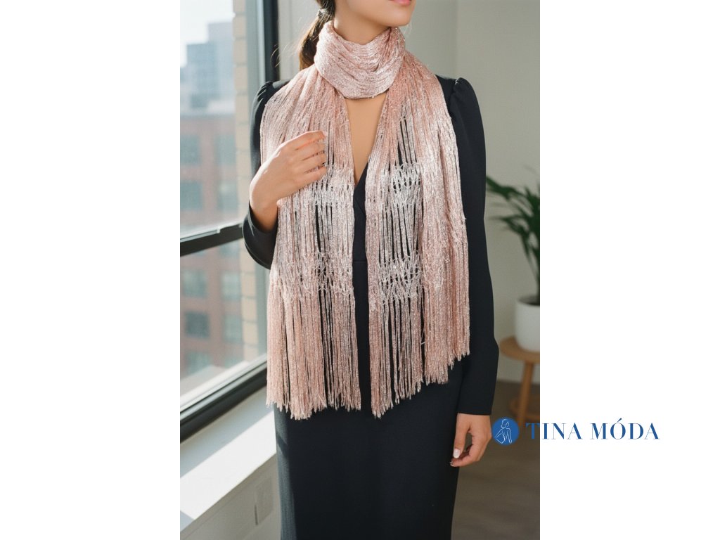 Šála ve světle jemné růžové barvě se zajímavým pleteným vzorem, šála je doplněna a zdobena stříbrným lurexovým vláknem. V elegantní kombinaci s šaty i k saku v různých barvách bude zářit. Šála na slavnostní příležitosti jako doplněk k šatům, přes ramena nebo kolem krku ... fantazii se meze nekladou. I k běžnému outfitu do práce, buďte odvážná. Praní viz. etiketa údržby.