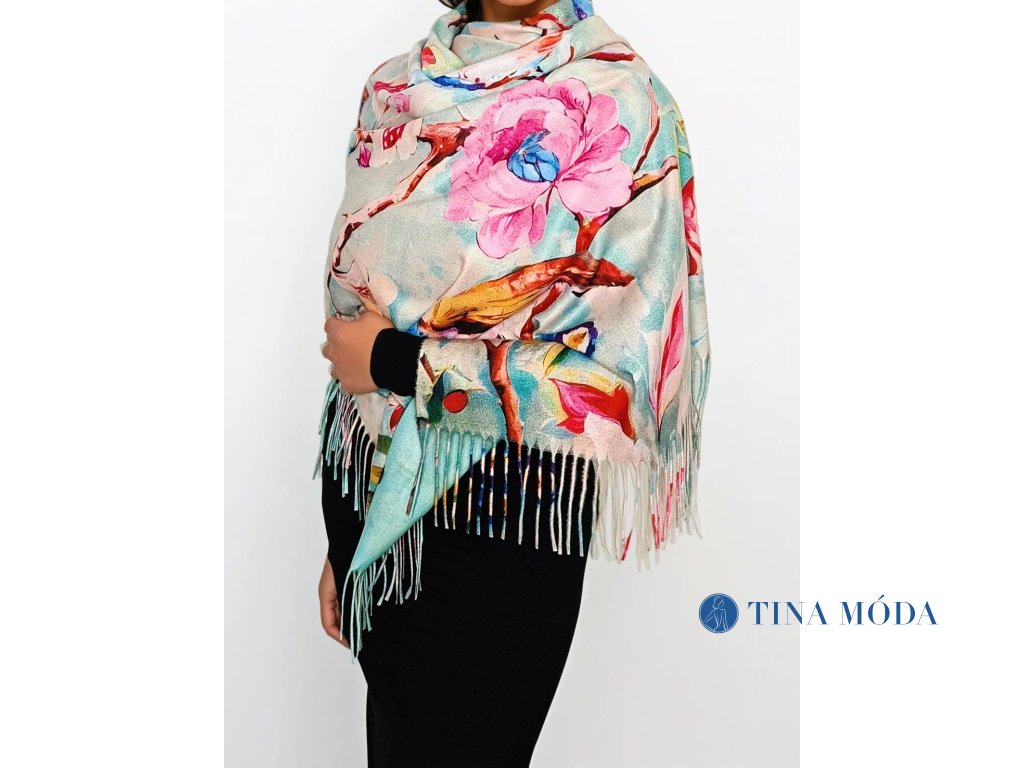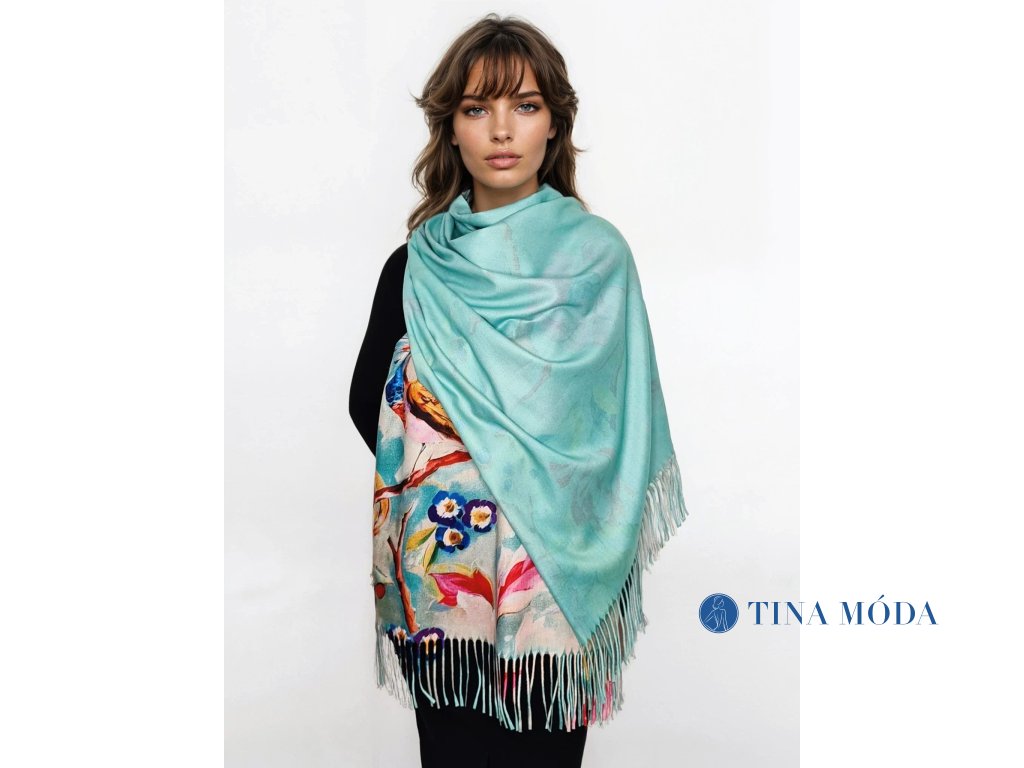 Dámská vlněná šála tyrkysová květinová s pávem veselé barvy pašmína pashmina