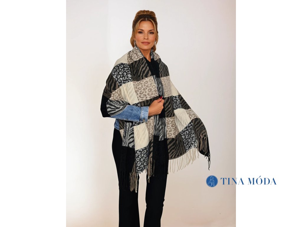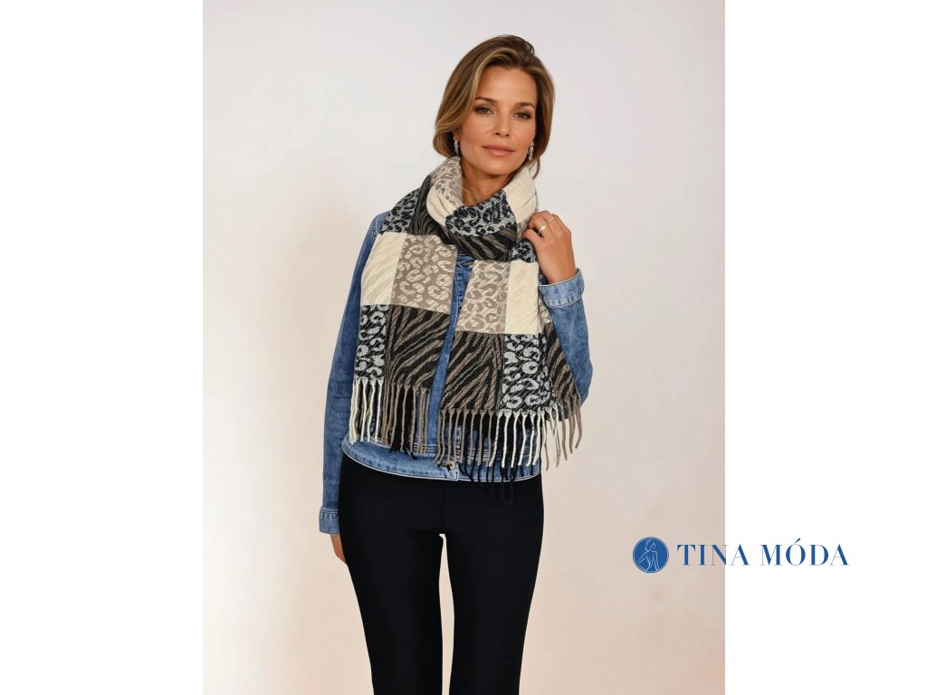 Dámská zimní kostkovaná vlněná šála se zvířecími vzory smetanová, hnědá a černá