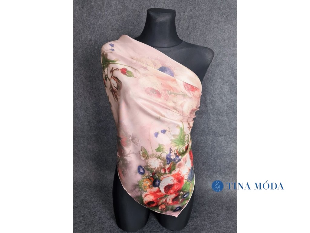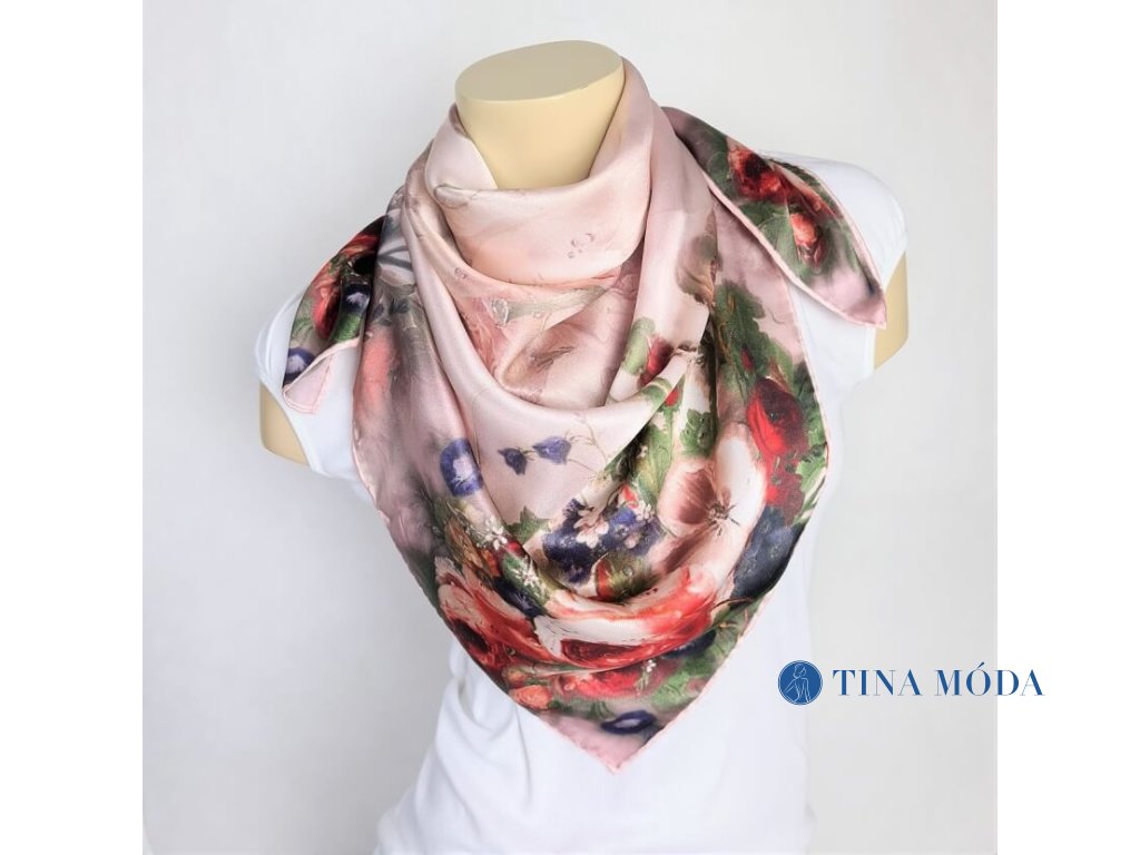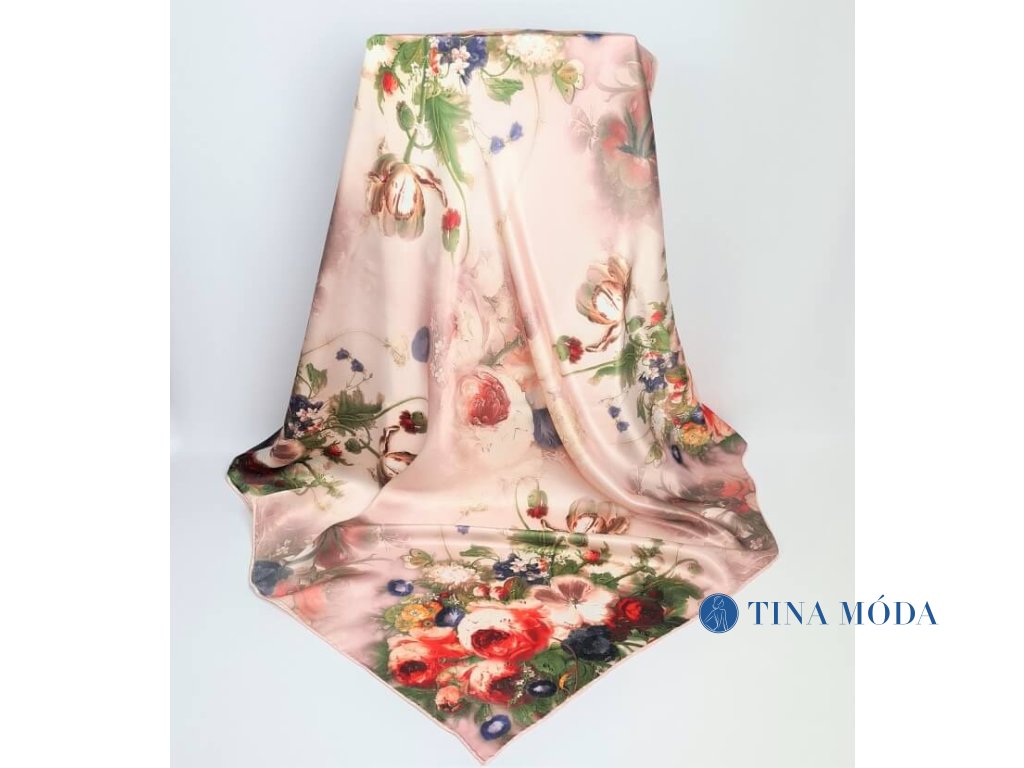 Dámský hedvábný květinový šátek velký čtvercový jemně růžový červený 100% hedvábí květiny