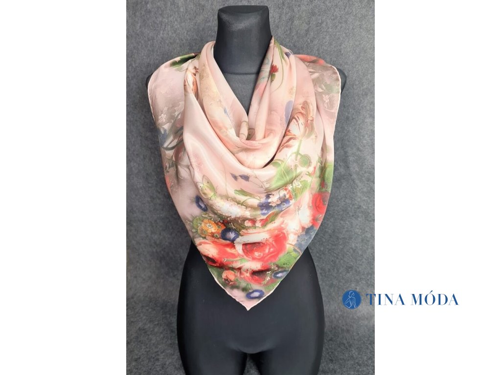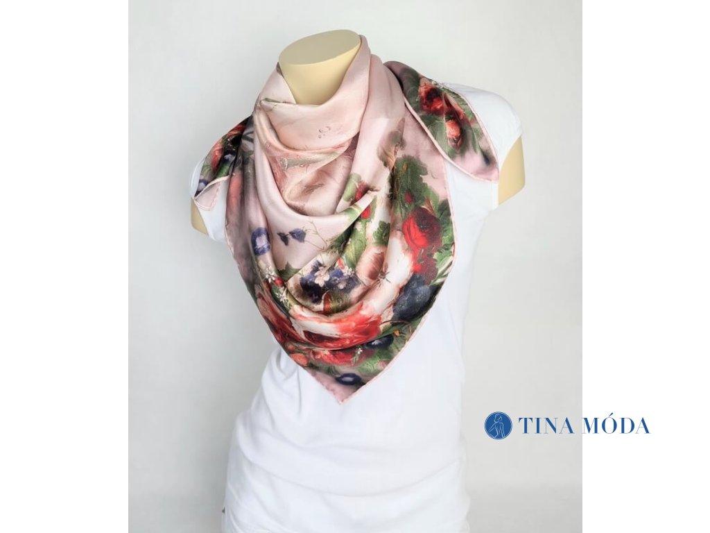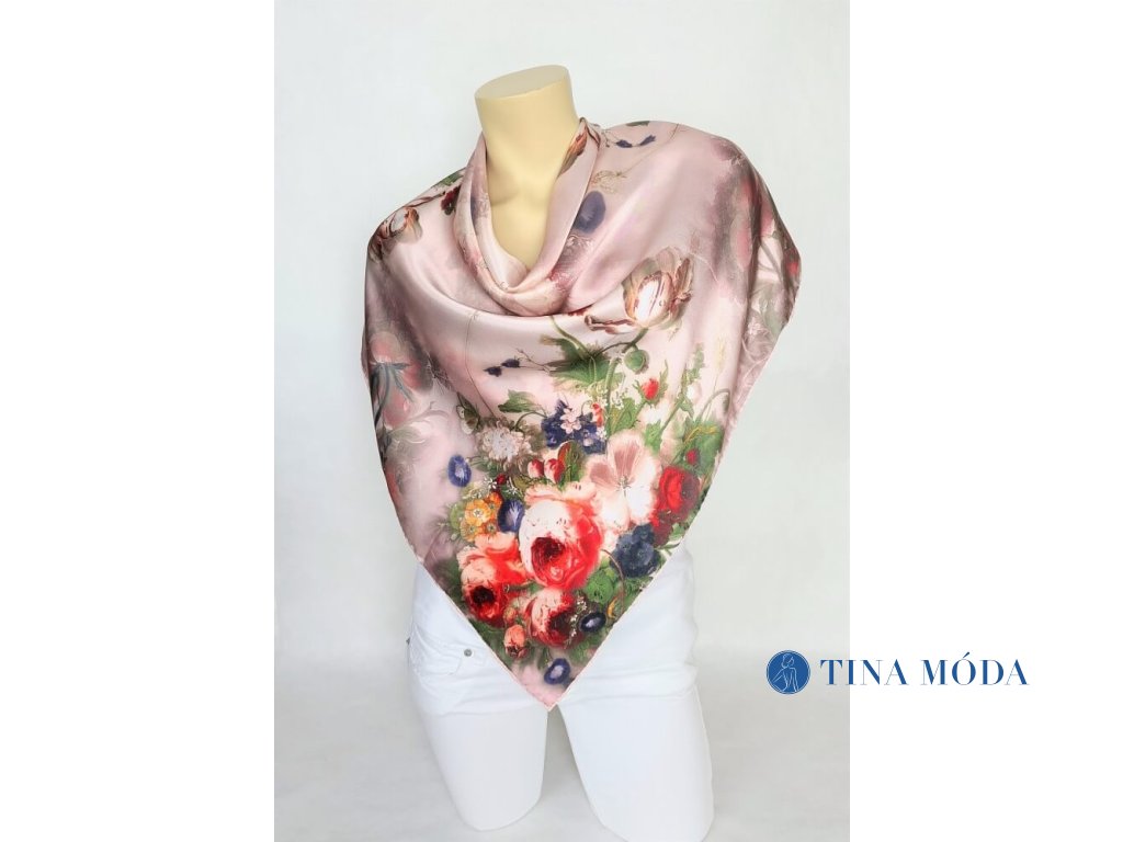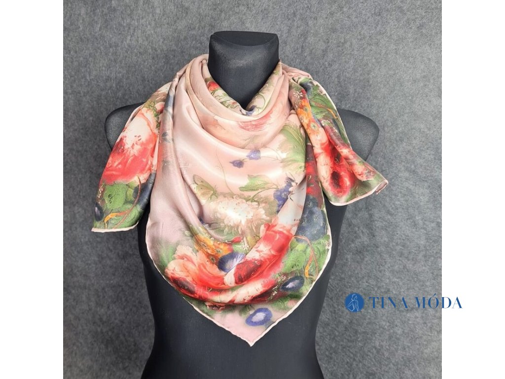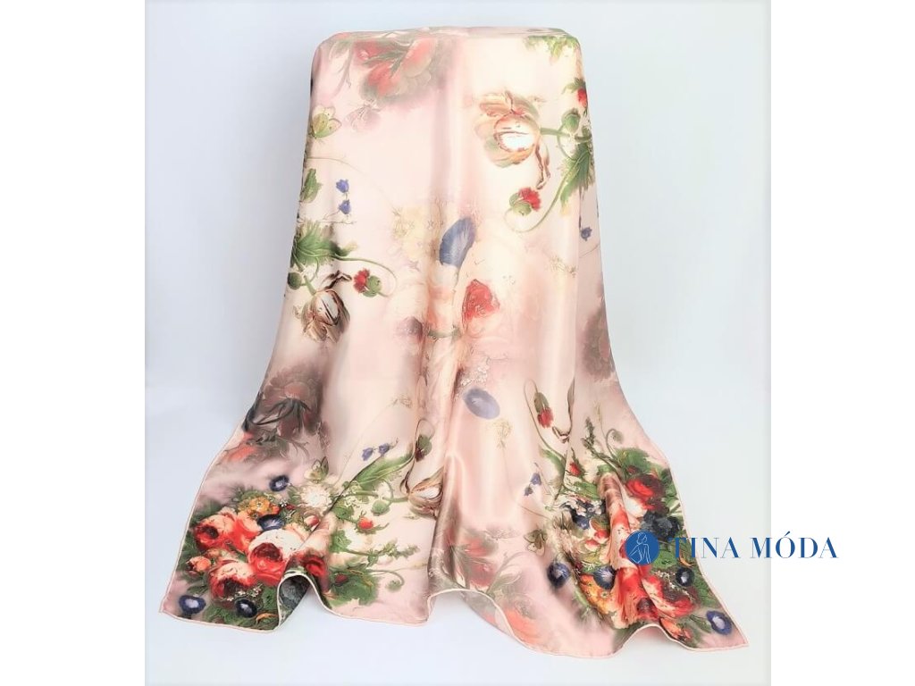 Luxusní hedvábný šátek 90 x 90 cm velký 100% čisté hedvábí čtvercový - květy s kapkami rosy
