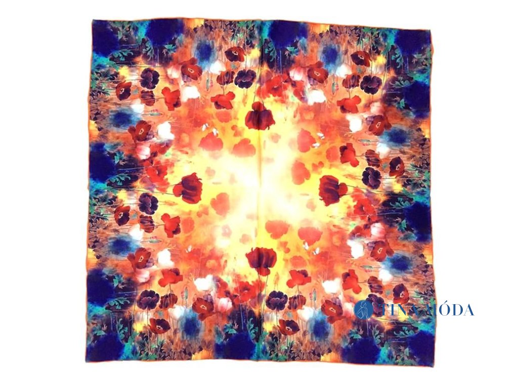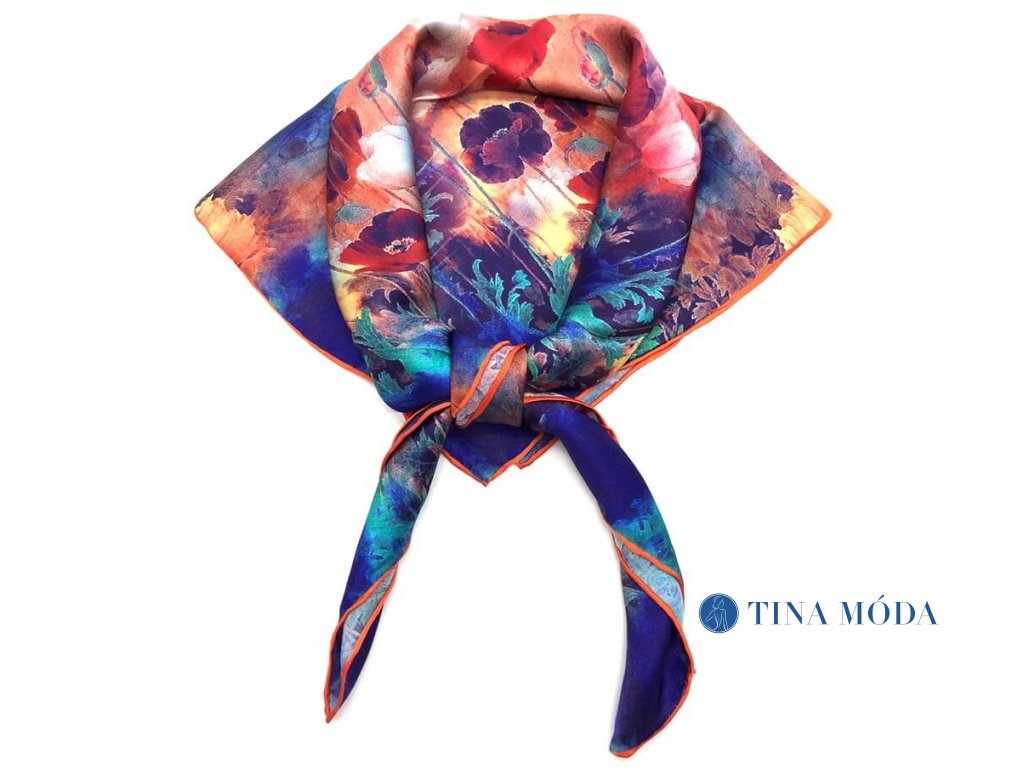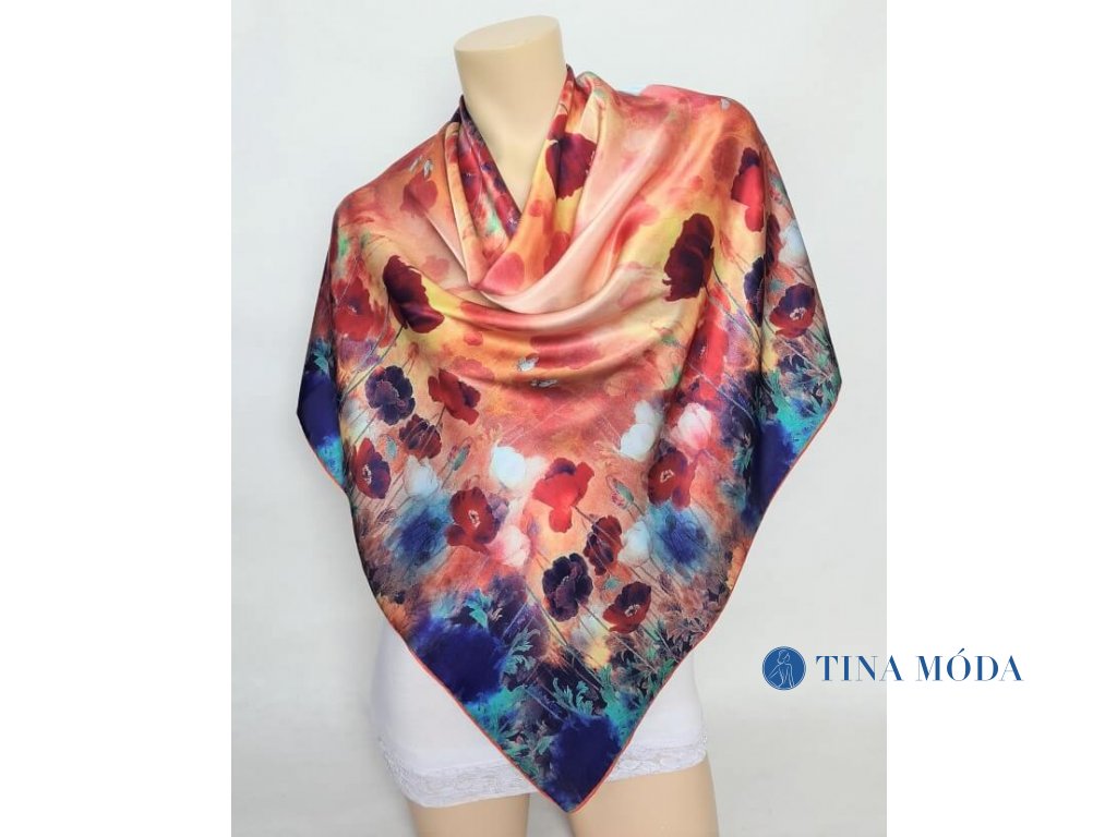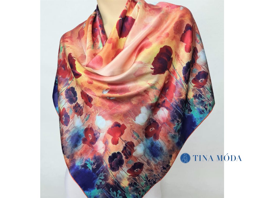 Dámský hedvábný květovaný šátek šála vlčí máky 100% hedvábí oranžová červená modrá