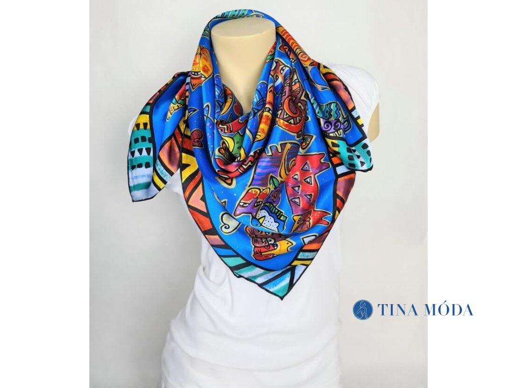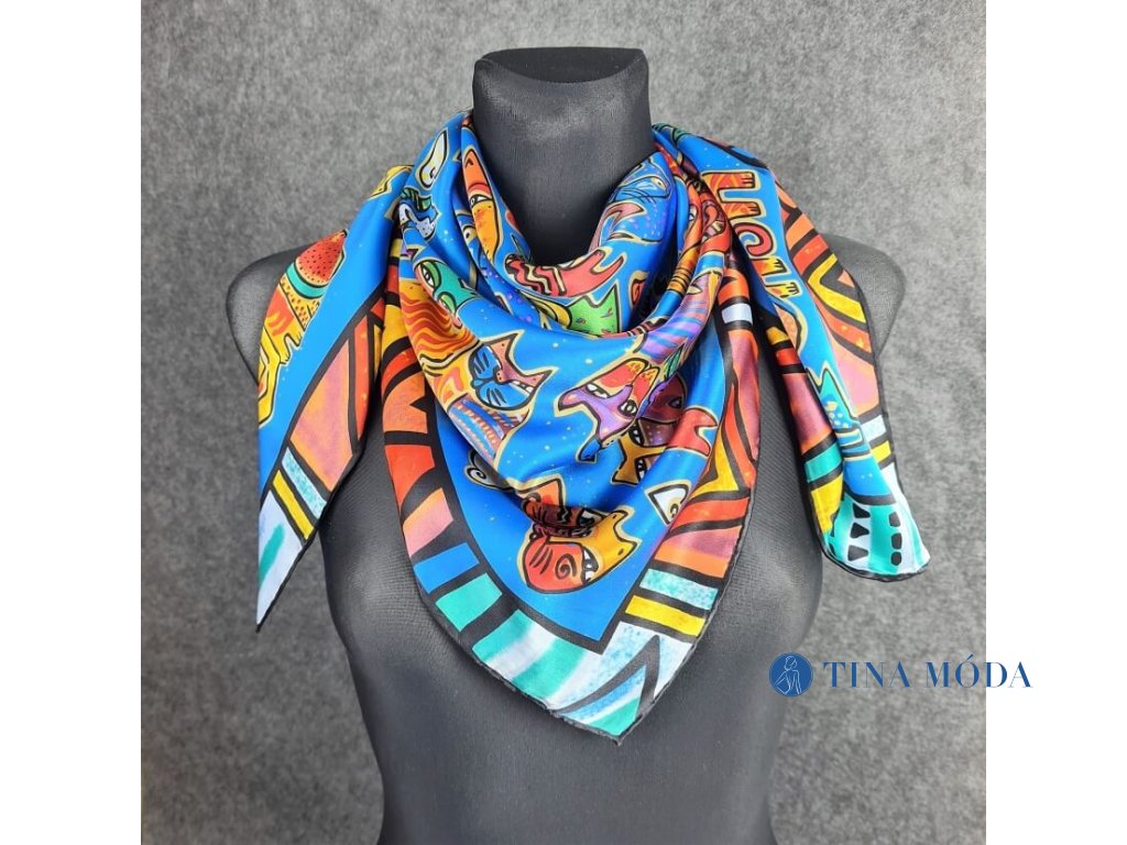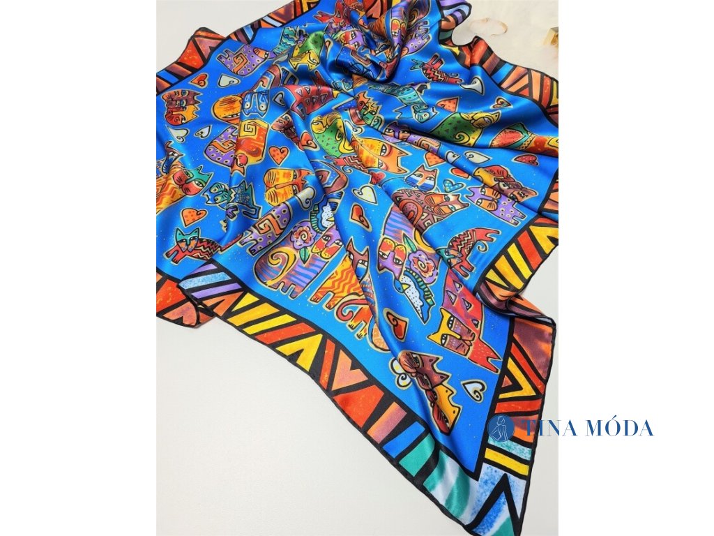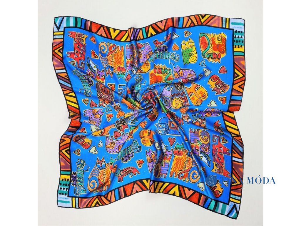 Dámský hedvábný šátek čtvercový modrý červený oranžový - kočky kočičky 100% hedvábí