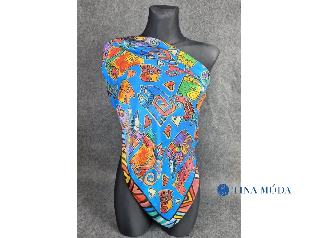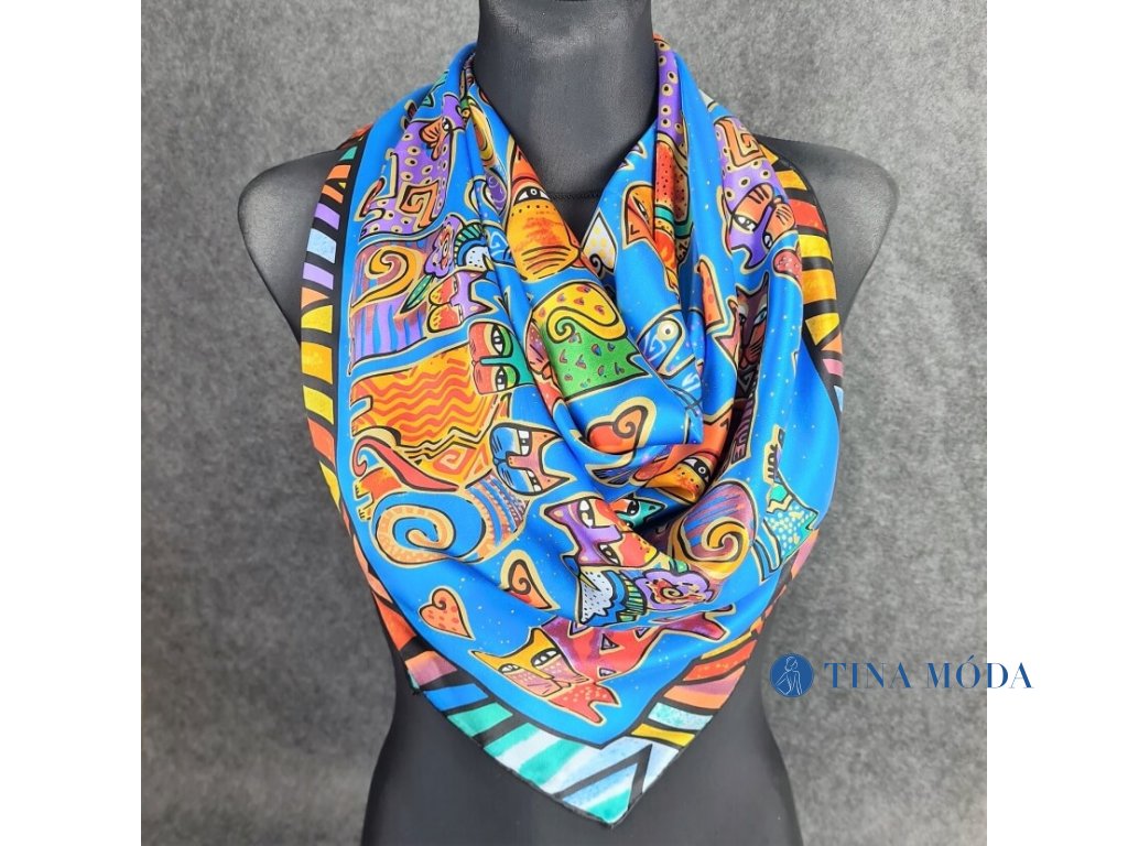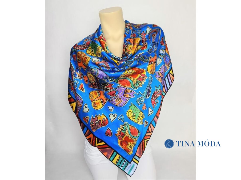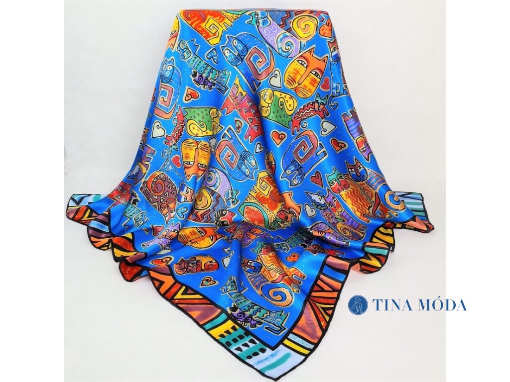 Luxusní hedvábný šátek 100% čisté hedvábí čtvercový, velký - vzor barevné kočky / kočičky