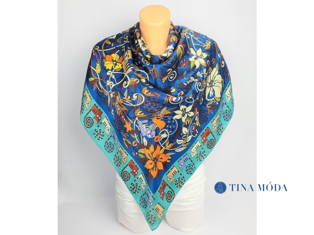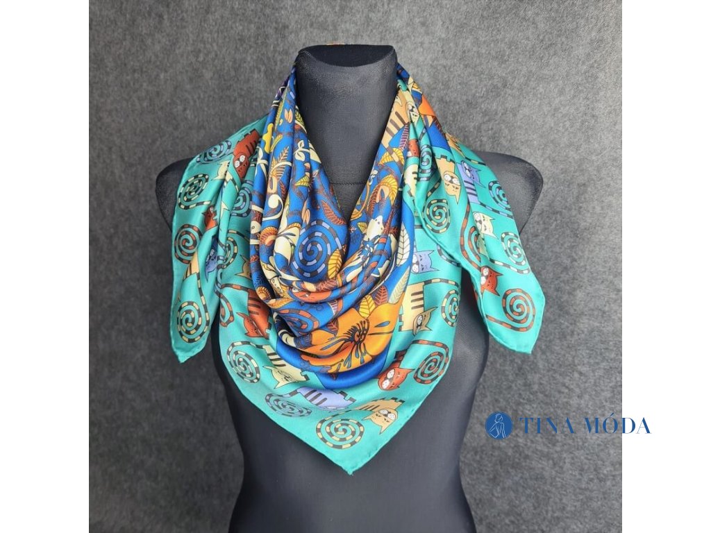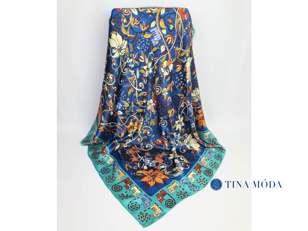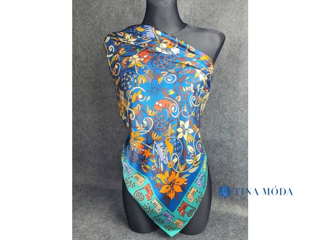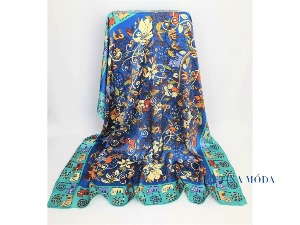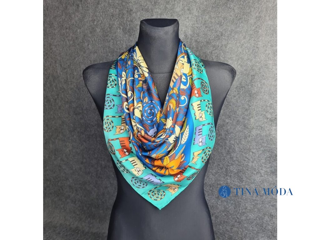 Dámský hedvábný šátek modrý tyrkysový hnědý - kočky kočičky květy