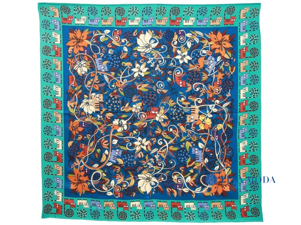 Luxusní hedvábný šátek 100% čisté hedvábí čtvercový, velký - zahrada plná koček / kočiček, květy