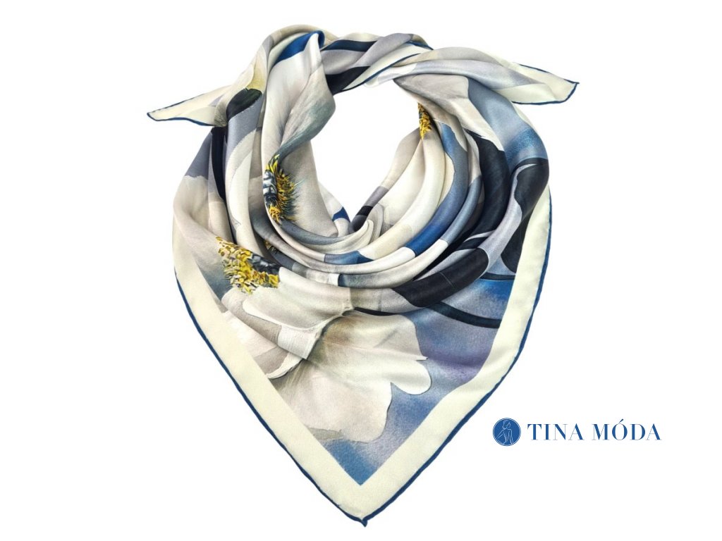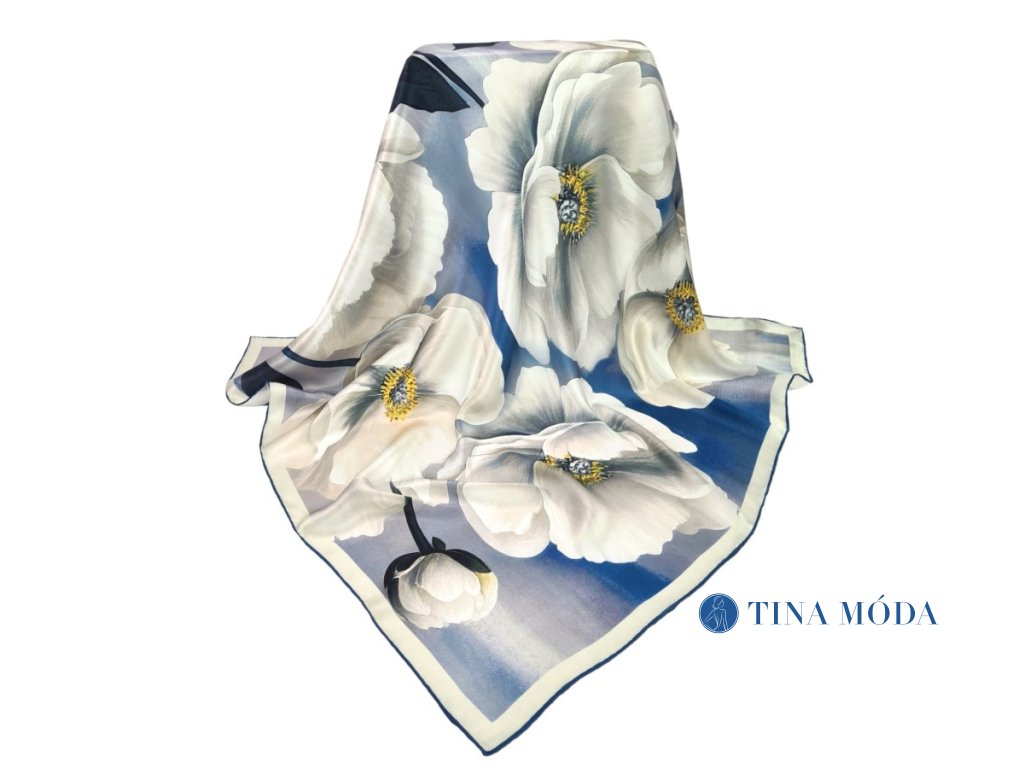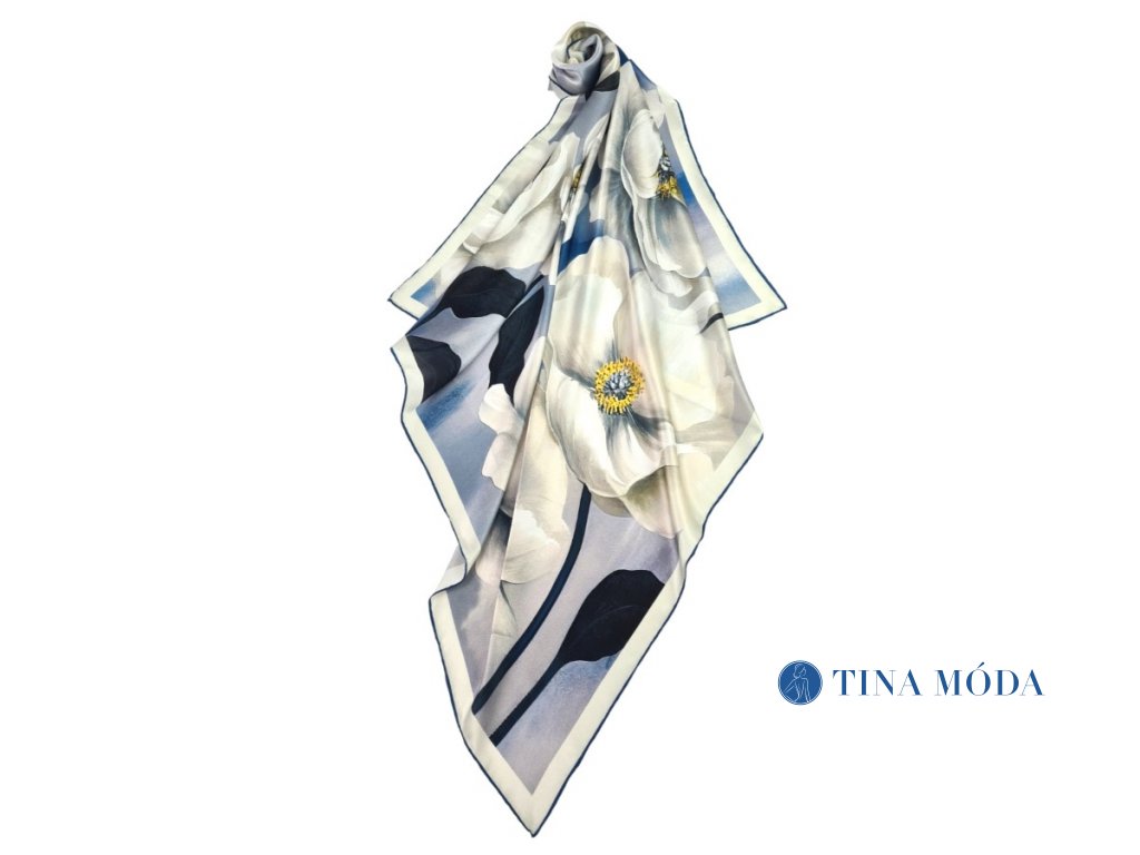 Dámský hedvábný šátek velké bílé květy na šedomodré