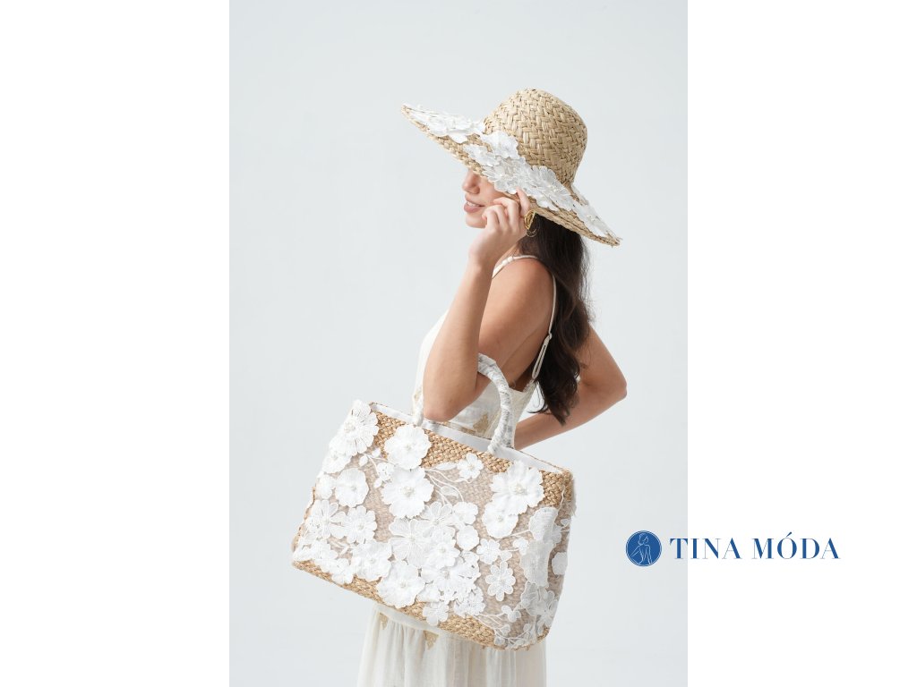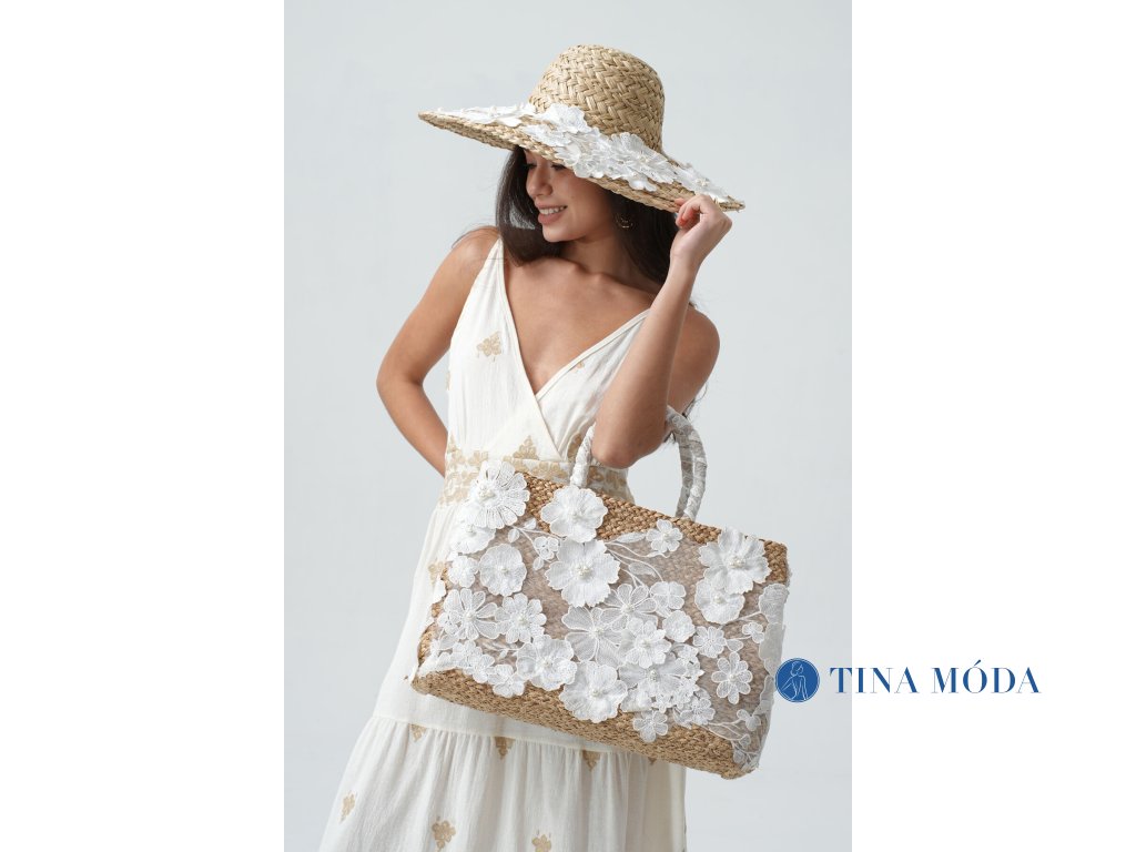 Letní zdobně vyšívaný dámský klobouk z přírodní slámy. Koruna je kulatá a celá krempa je pošita květinovou krajkou v bílé barvě, středy květů zdobí perličky. Klobouk v létě využijete na každodenní nošení, nejen jako ochranu před sluncem, ale i jako módní doplněk na párty i na pláž ... dodá vám elegantní šarm a šmrnc.