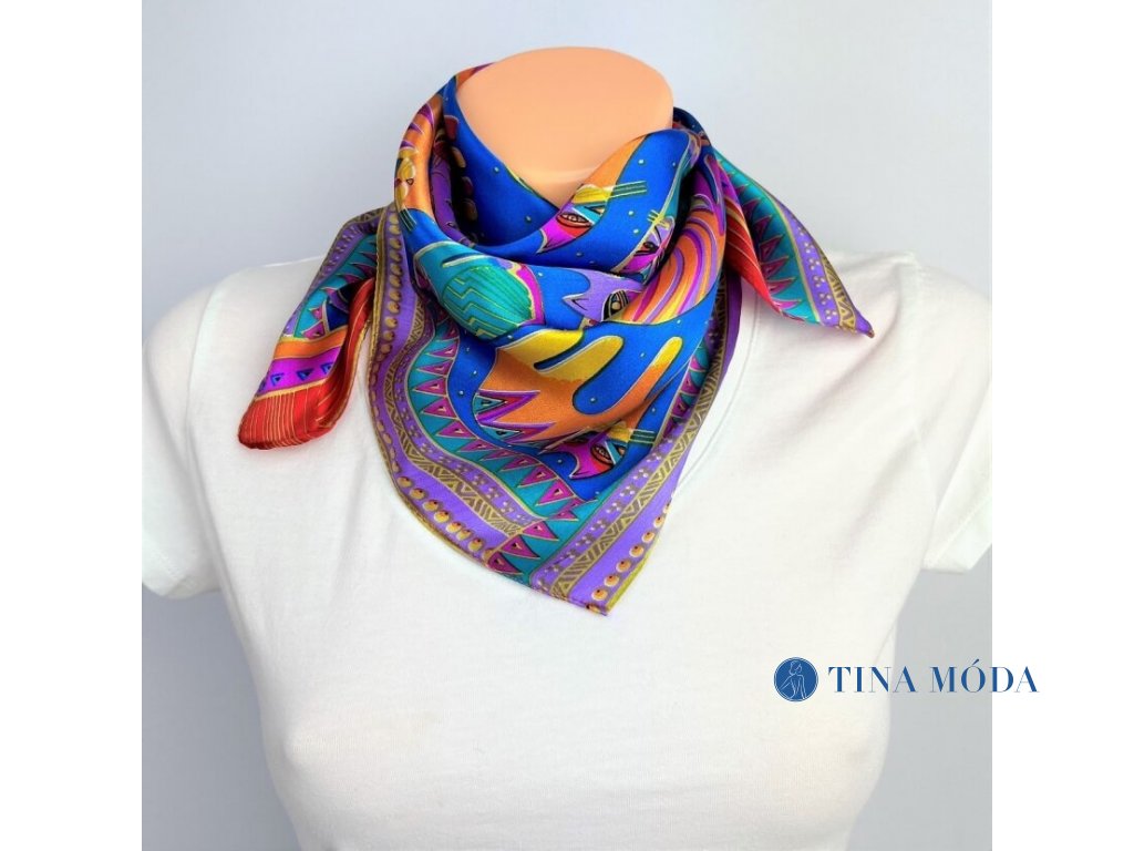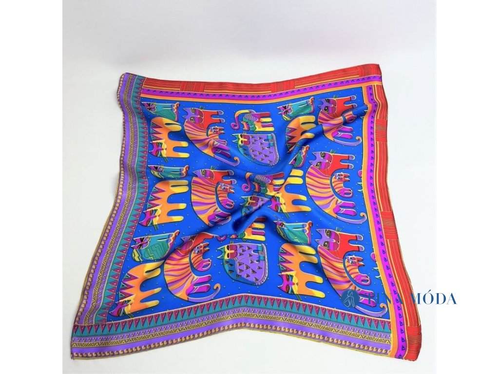 Vzorovaný šátek můžete nakombinovat k šatům, ale i kalhotovému kostýmu. Hedvábný šátek je příjemný na kůži a jemný na omak. V létě Vás ochladí, naopak v zimě zahřeje. Pro odvážné lze použít jako ozdoba do vlasů, zápěstí nebo ozdobit kabelku.