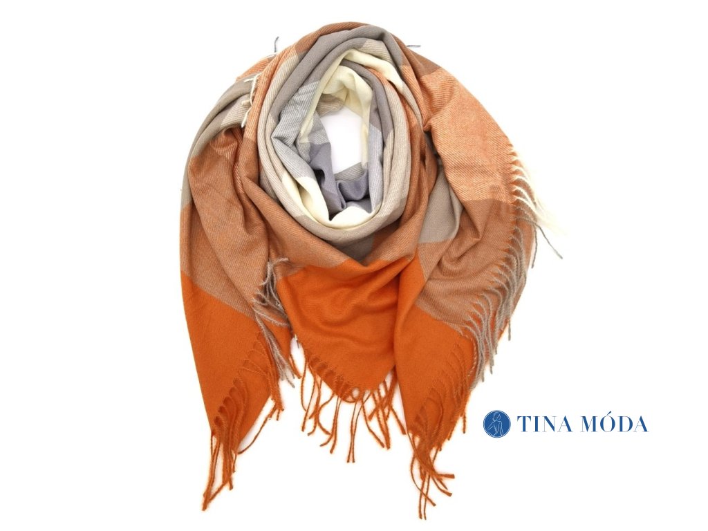 Dámský / pánský vlněný šátek v oranžové s kostkovaným karo vzorem a třásně