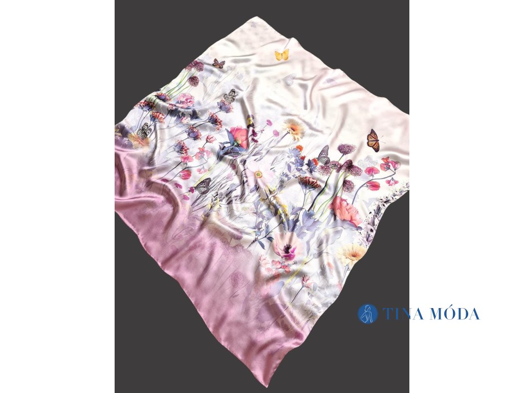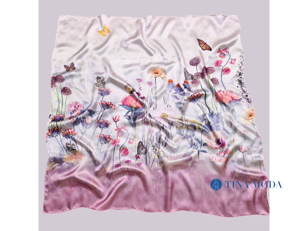 Dámský slavnostní šátek z pravého hedvábí v krásné barevné růžové kombinaci s přechody odstínů. Můžete vzít na svatbu nebo zahradní párty. Šátek se vzorem květin, listů a poletujícími motýly. Zahalte se do pravého hedvábí a hedvábný svět máte u sebe.