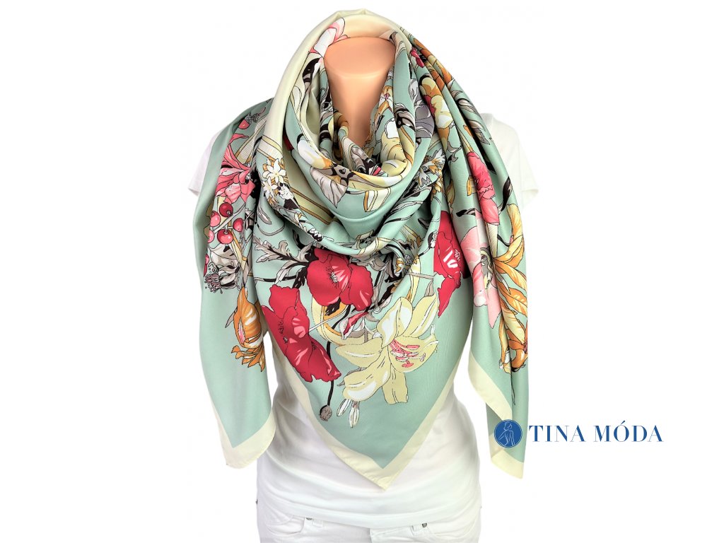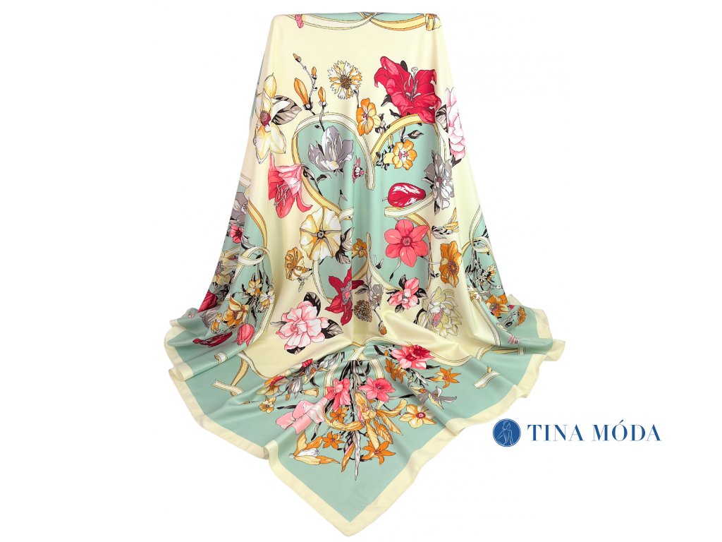 Dámský šátek z viskózy (rayon) velký XXL 130 cm zelený, béžový, červený s květy a mašlí