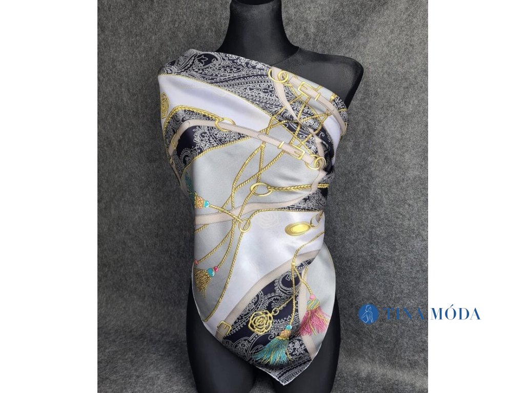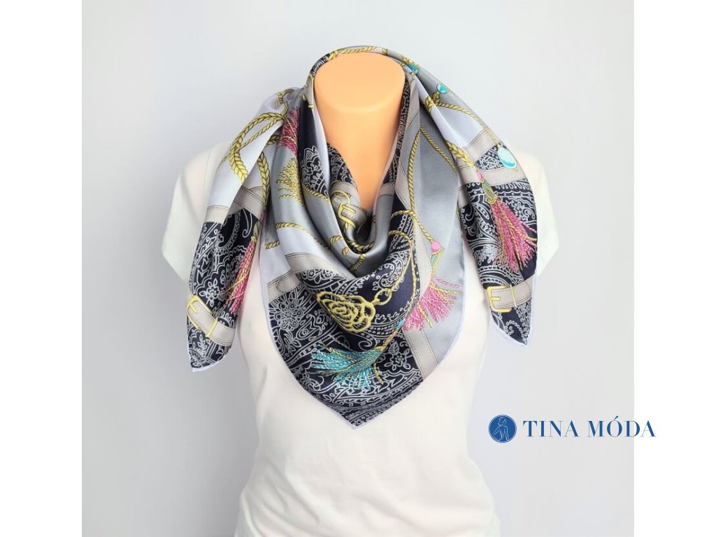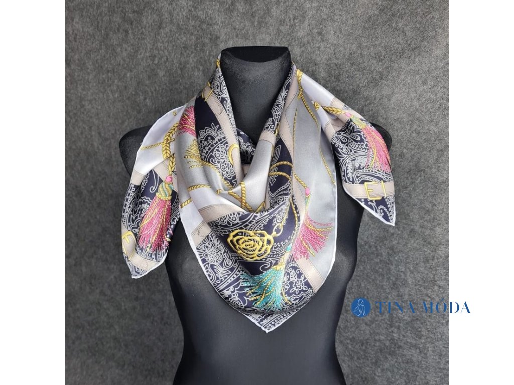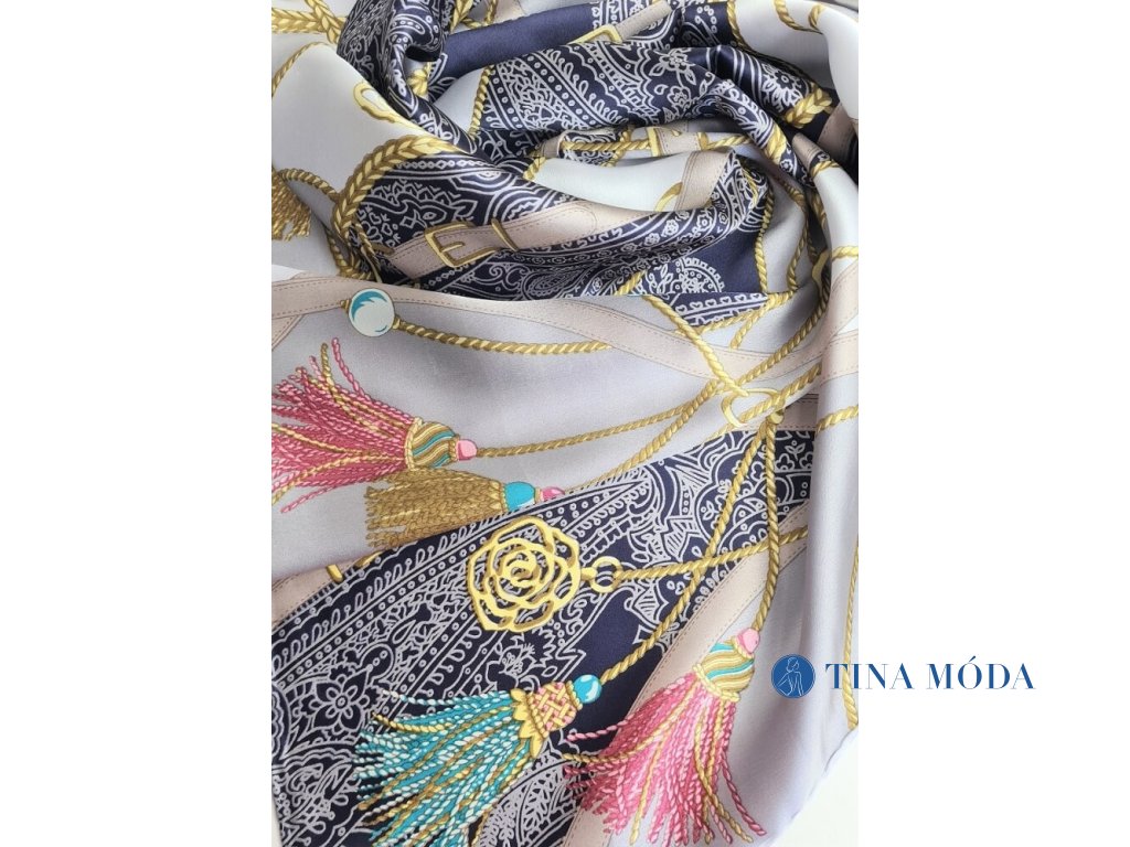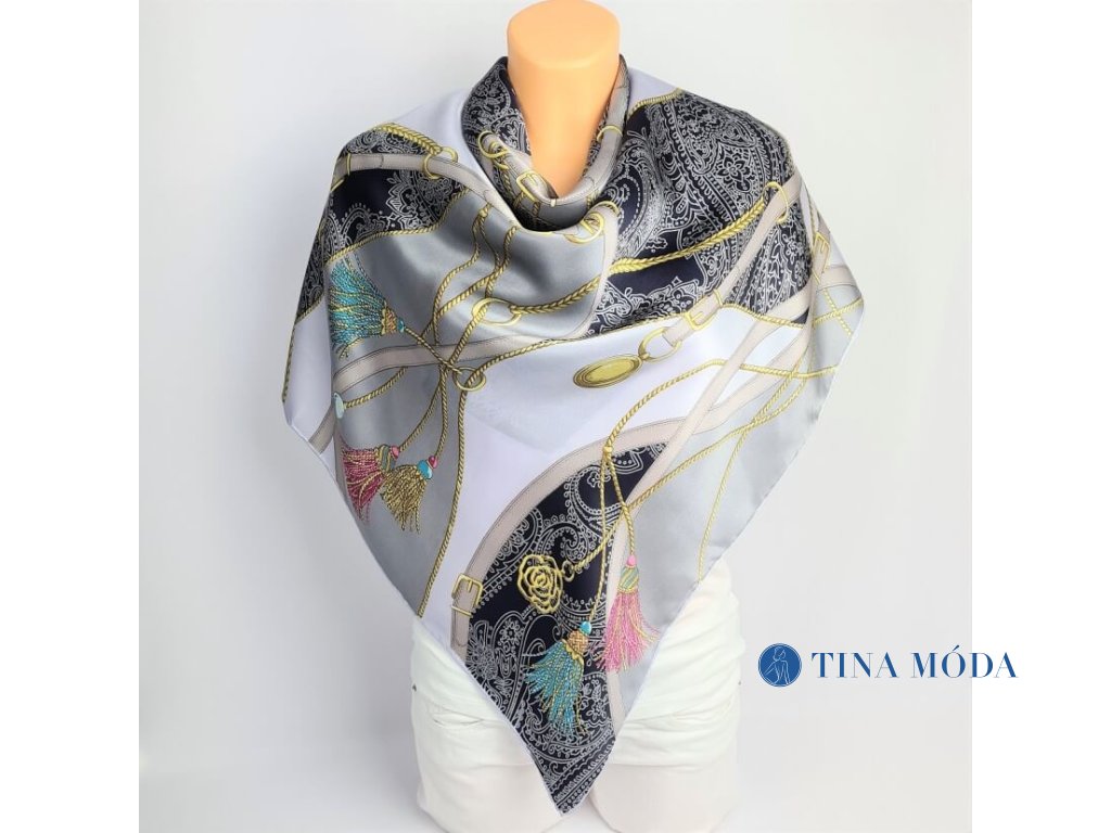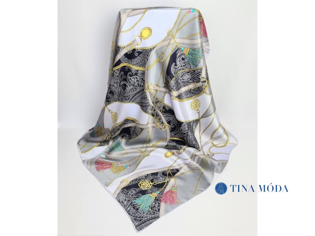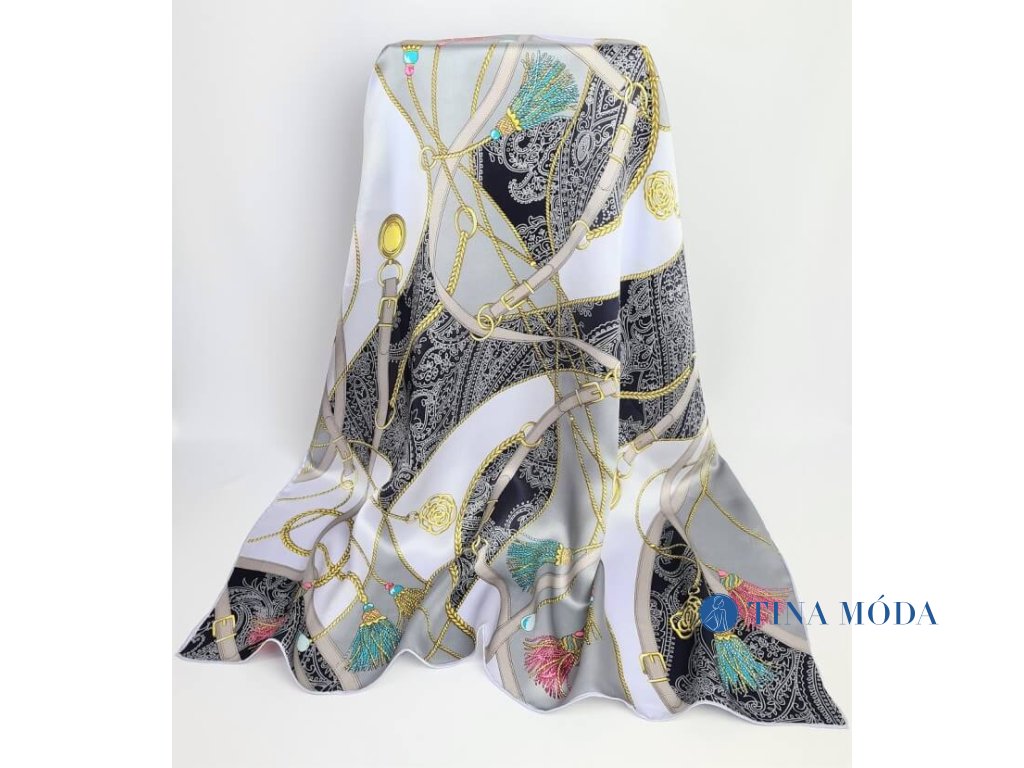 Luxusní jemný hedvábný šátek šála 100% čisté hedvábí potisk s řetízky, popruhy a třapci