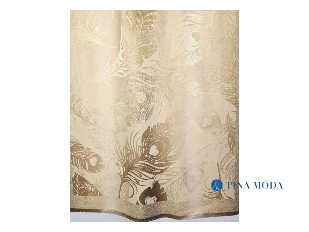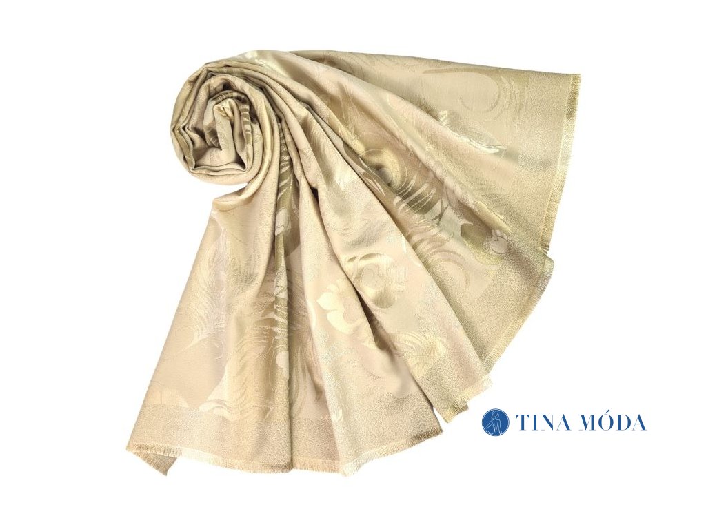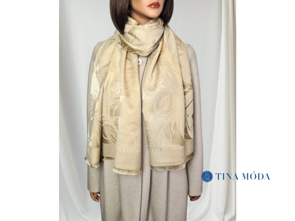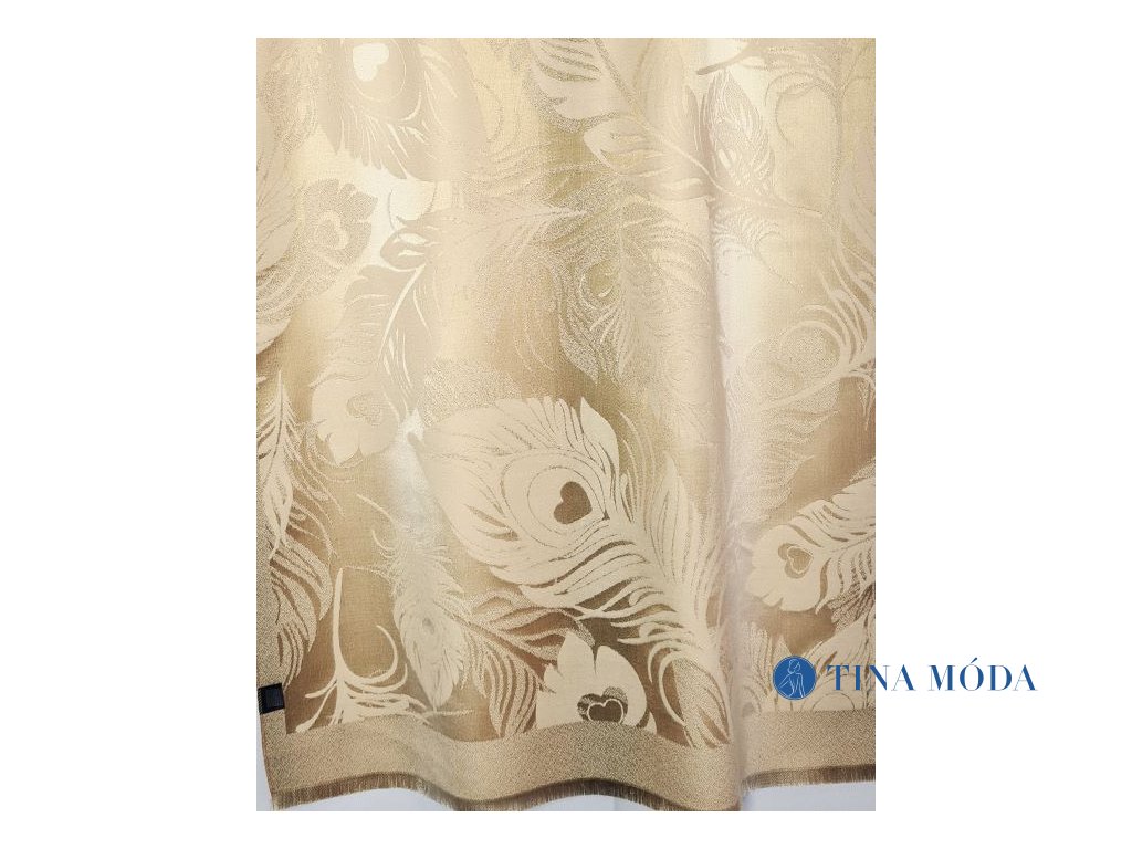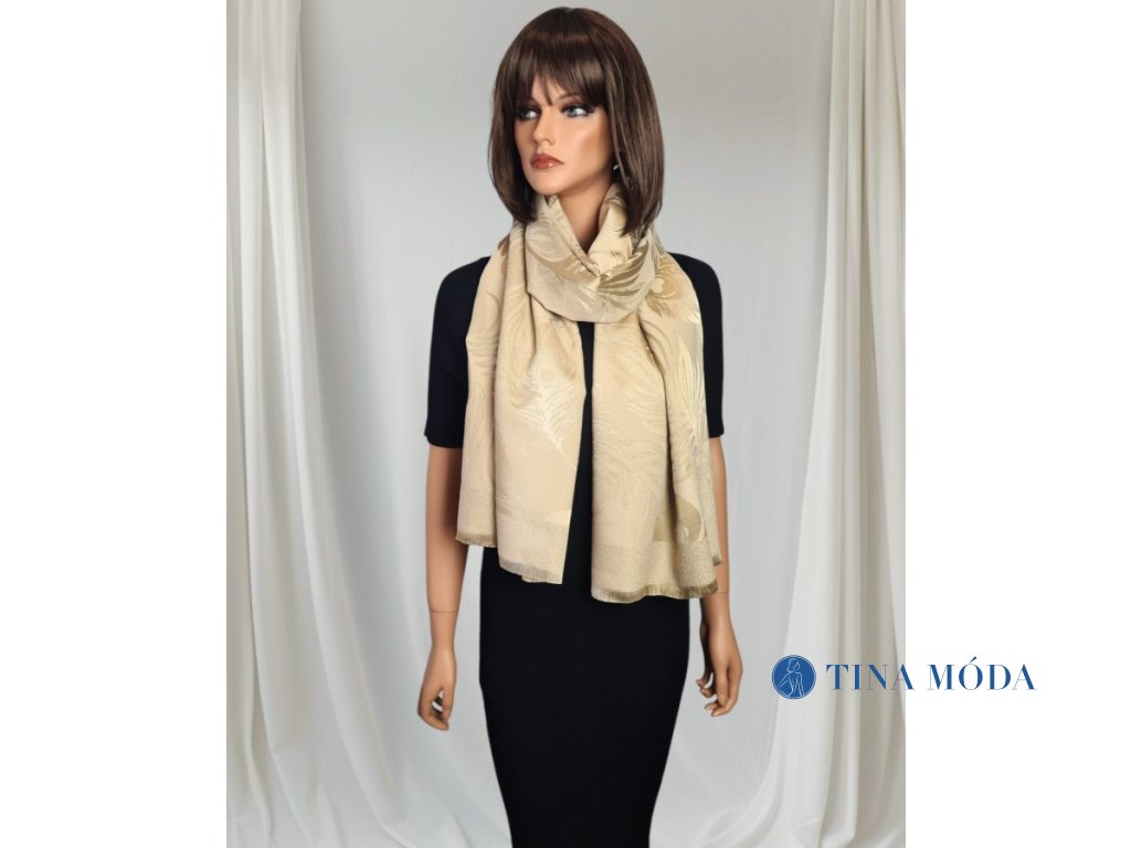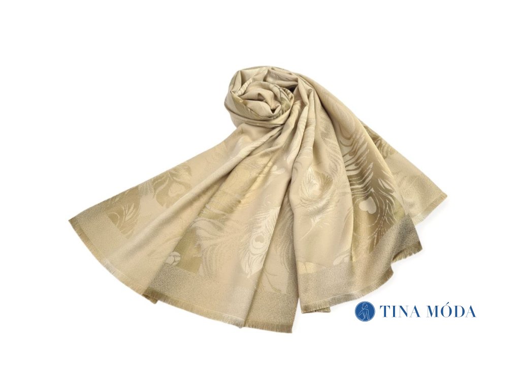 Elegantní béžová dámská šála s béžovými peříčky v zlatém tónu