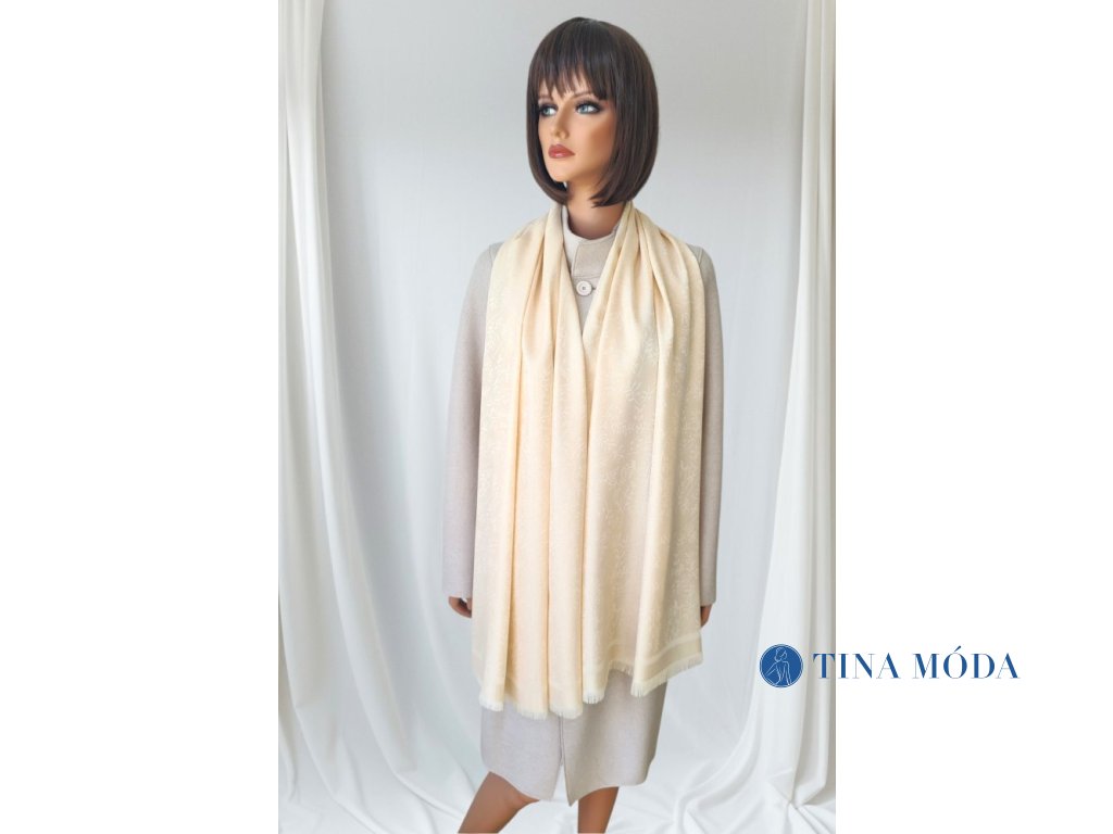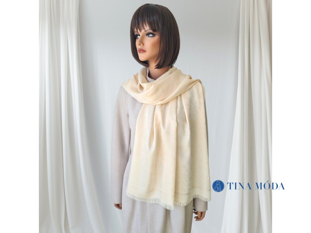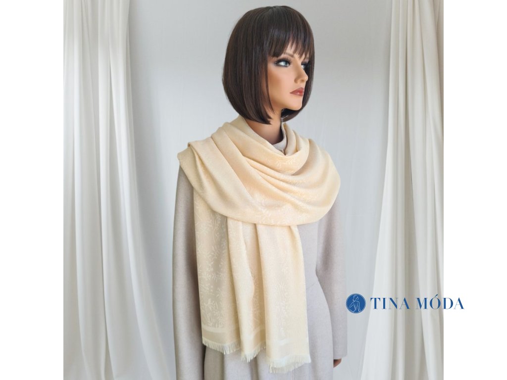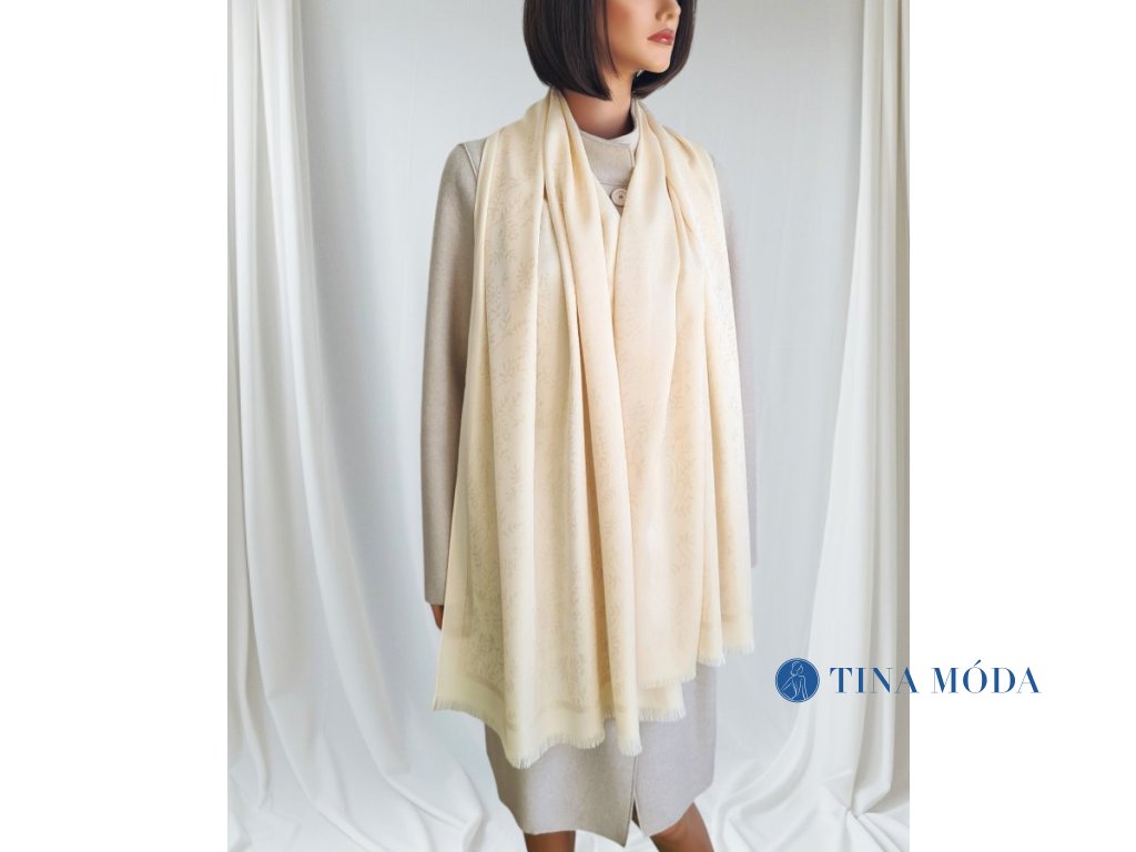 Jemná a měkká šála v elegantní béžové, zdobená zlatým vzorem květin a rostlin. Využijete na denní nošení jako krásný doplněk ke kabátu i šatům. Krásný doplněk k šatům na svatbu nebo zahradní párty. Také můžete vázat kolem krku, nosit jako pléd, pareo nebo přehoz přes ramena na šaty... libovolně. Materiál je příjemný na kůži, měkký - nekouše. Praní viz. etiketa údržby.