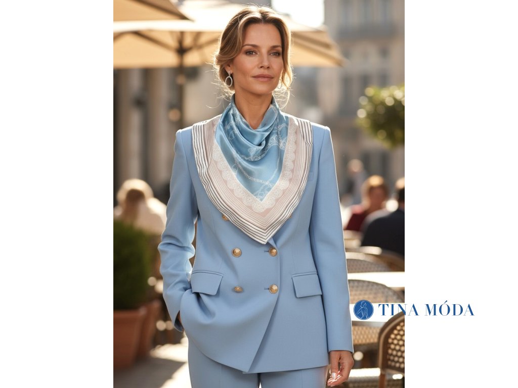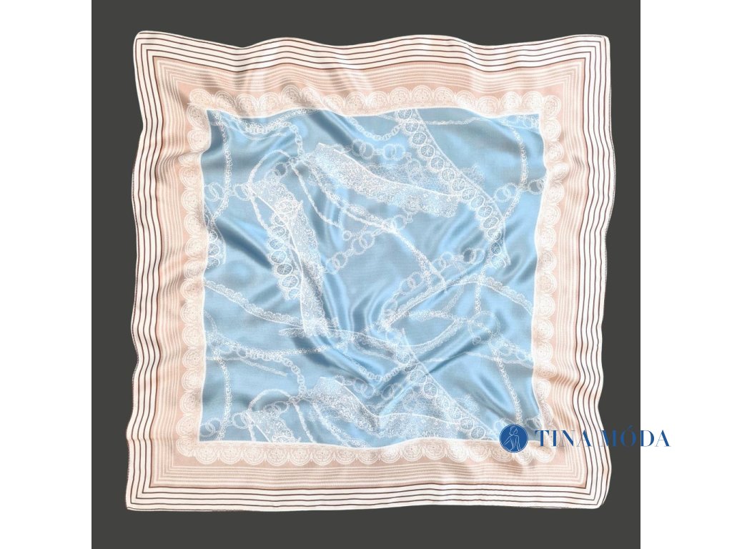 Elegantní světle modrý hedvábný šátek s krajkou a hnědým lemem