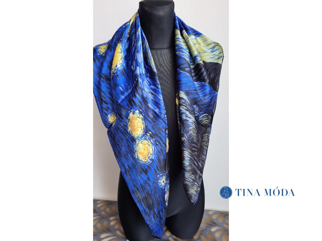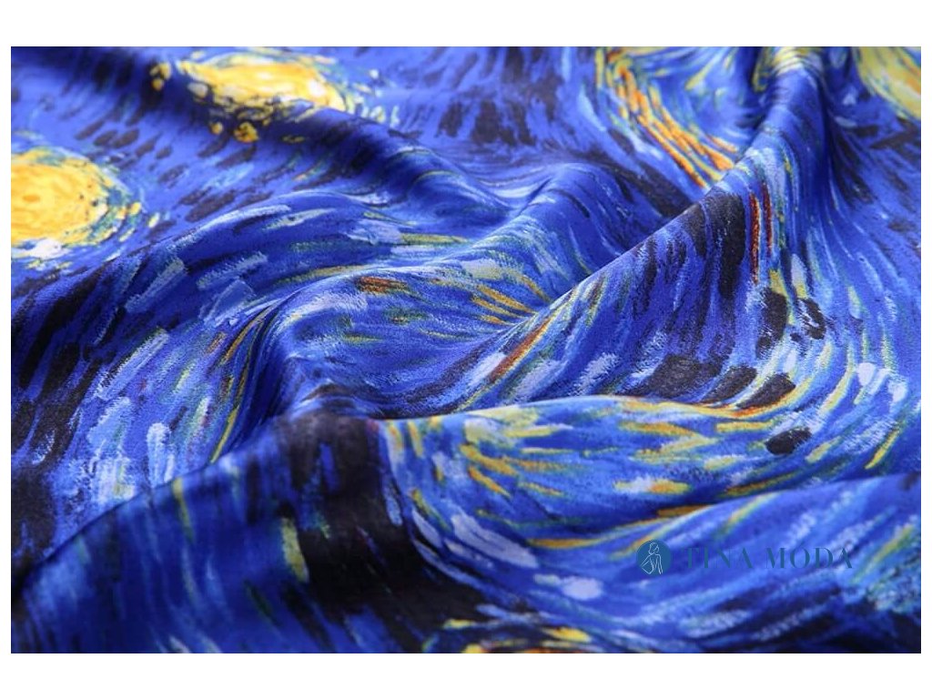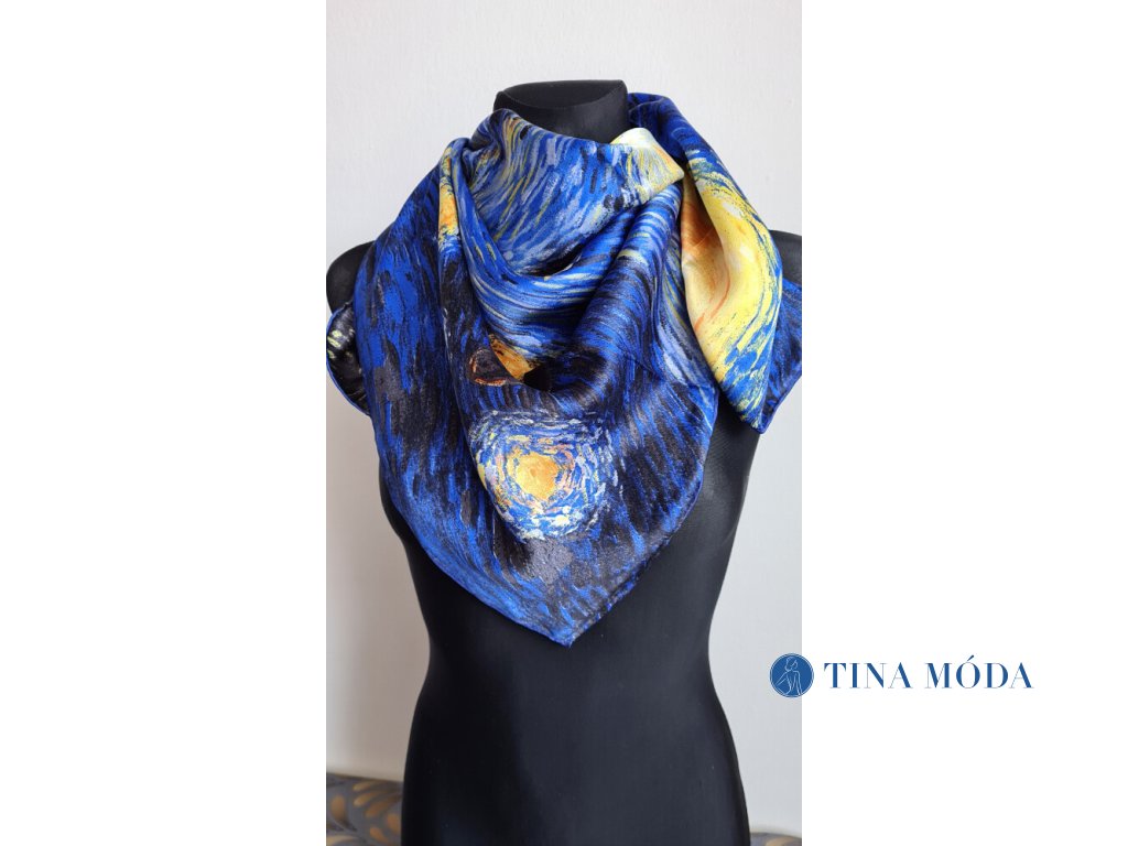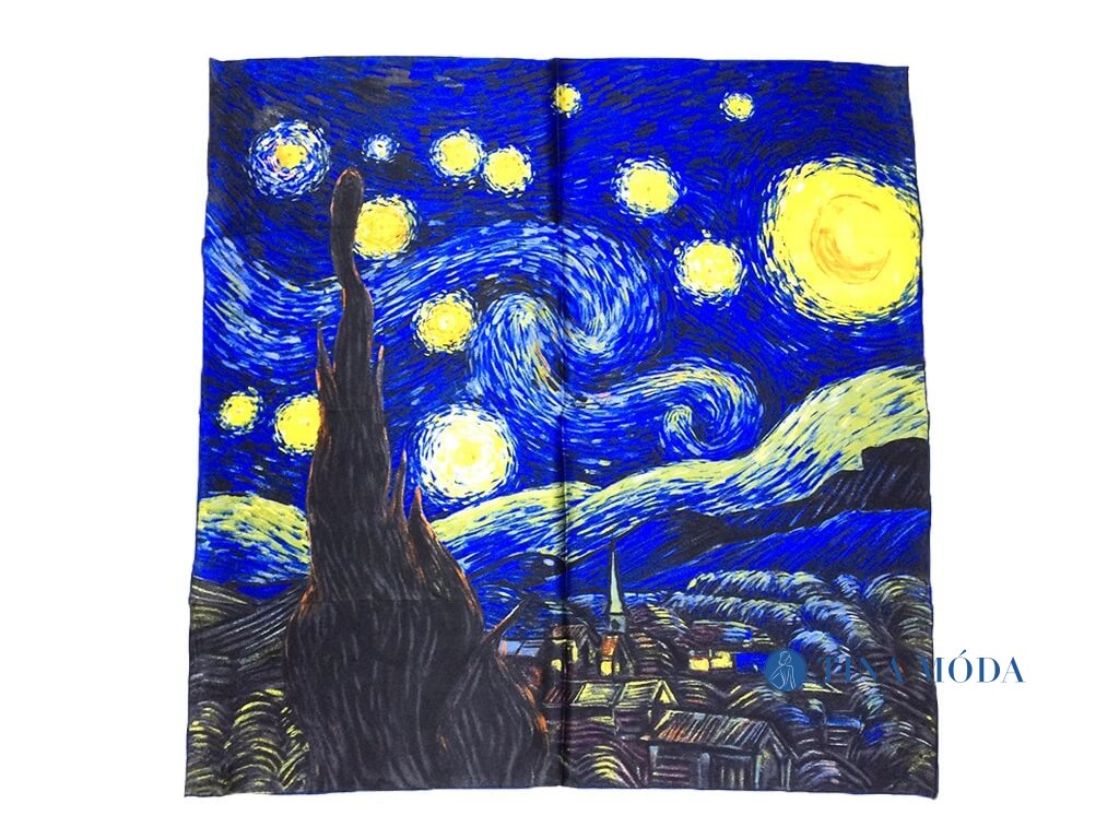 Luxusní jemný hedvábný šátek šála 100% čisté hedvábí Hvězdná obloha Vincent van Gogh - The Starry Night čtvercový modrý