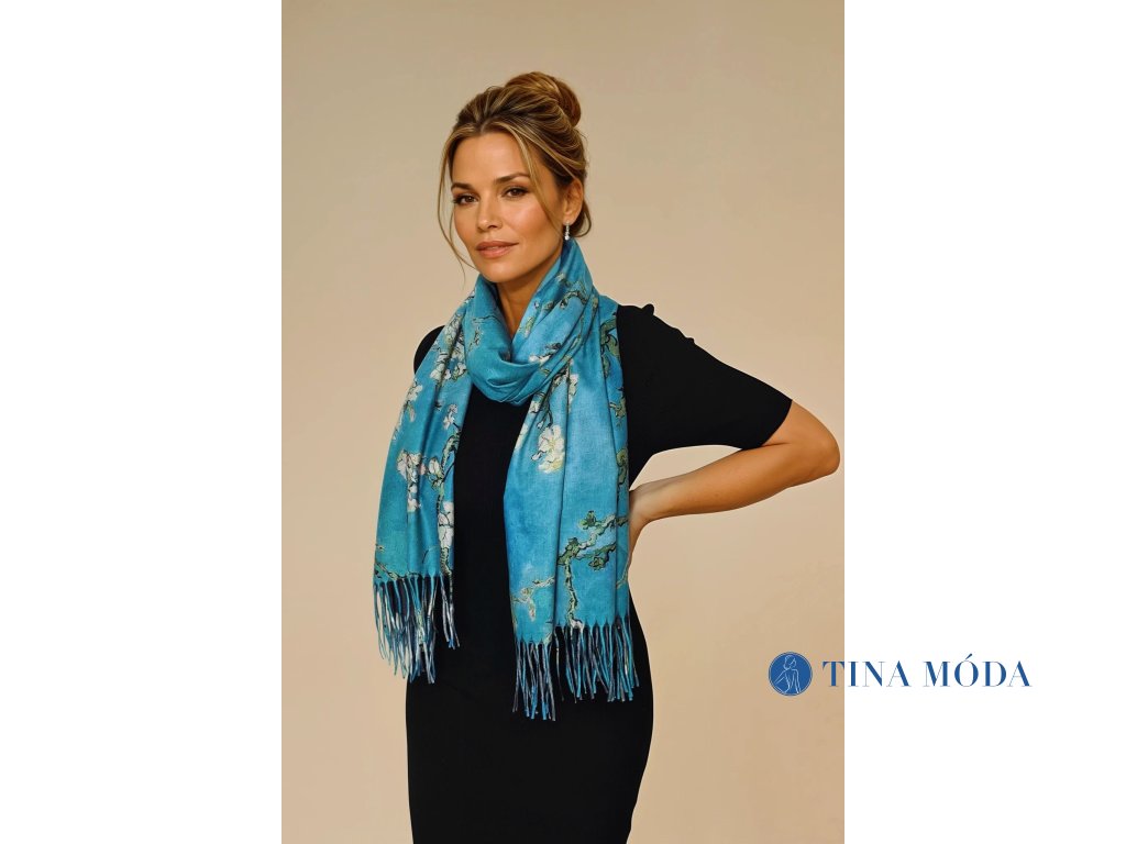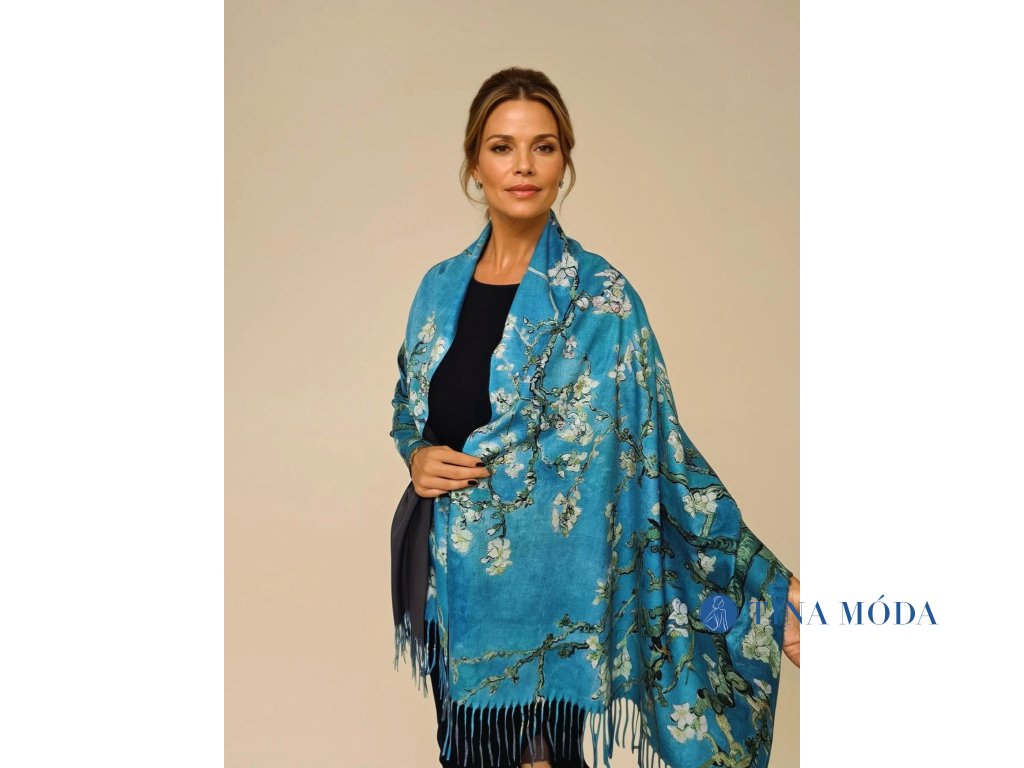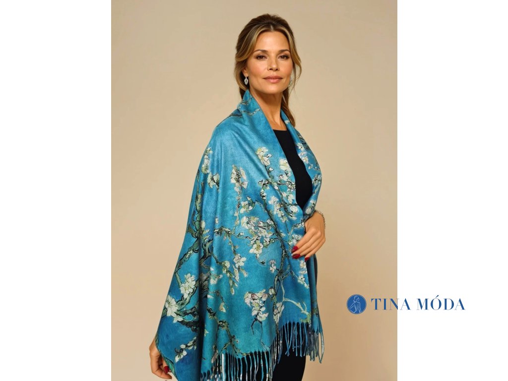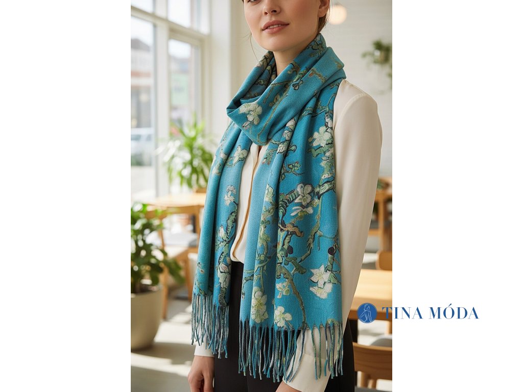 Jemná a měkká šála v tyrkysových barvách se vzorem obrazu Mandloně od van Gogha. Šála je příjemná a nekouše, zdobena třásněmi a lze ji nosit oboustranně. Krásný a luxusní doplněk k saku, kabátu i bundě. V zimě nebo na podzim zahřeje u krku, můžete použít, i jako pléd přes ramena na párty a jiné oslavy. Materiál je příjemný na kůži, měkký - nekouše. Praní viz. etiketa údržby.