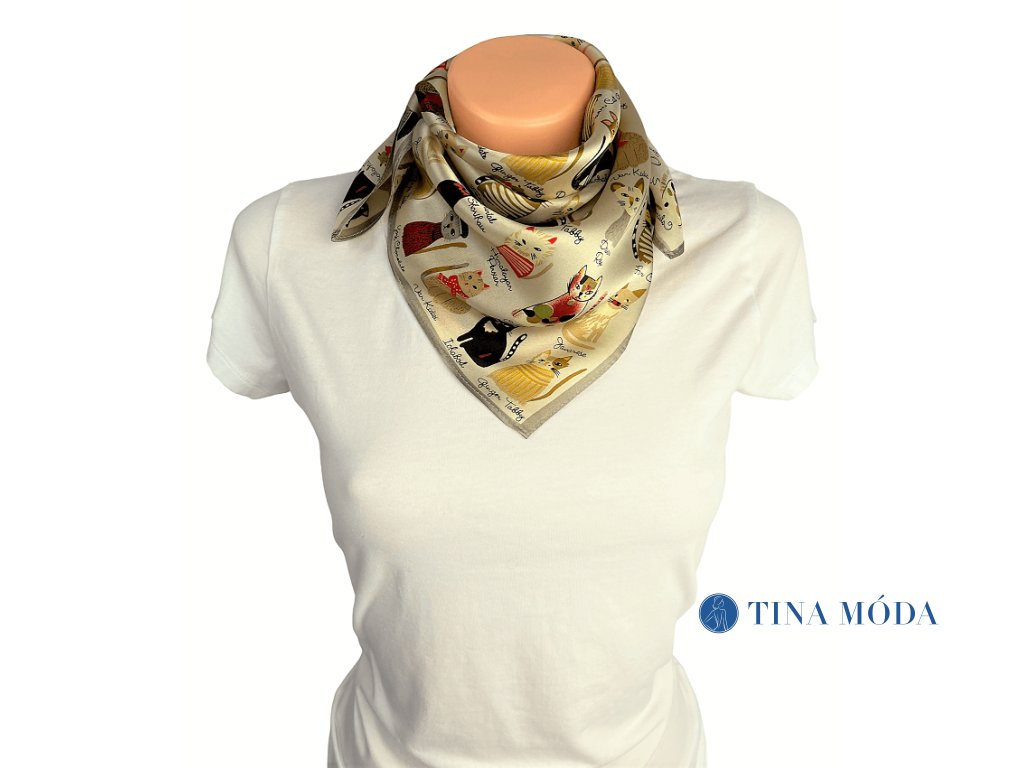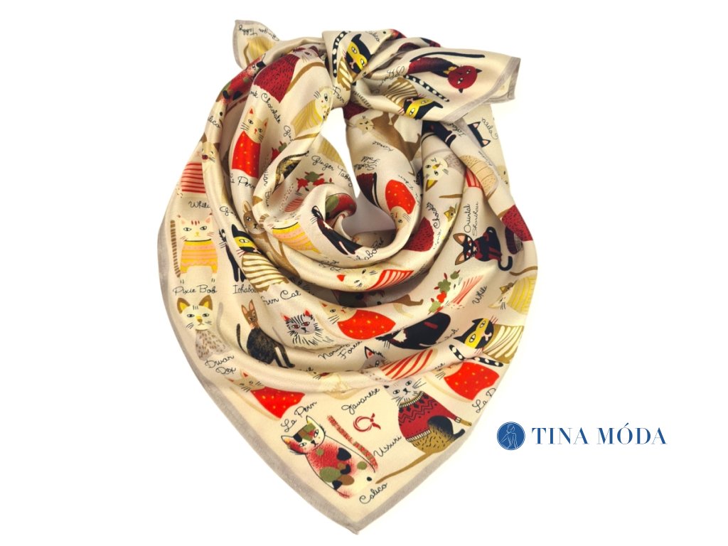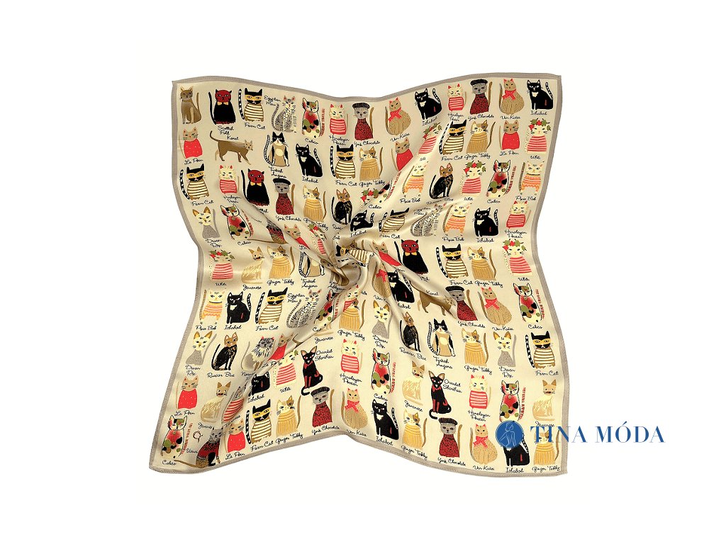 Malý letuškový hedvábný šátek béžový s kočkami ve francouzském stylu 50 cm 100% hedvábí