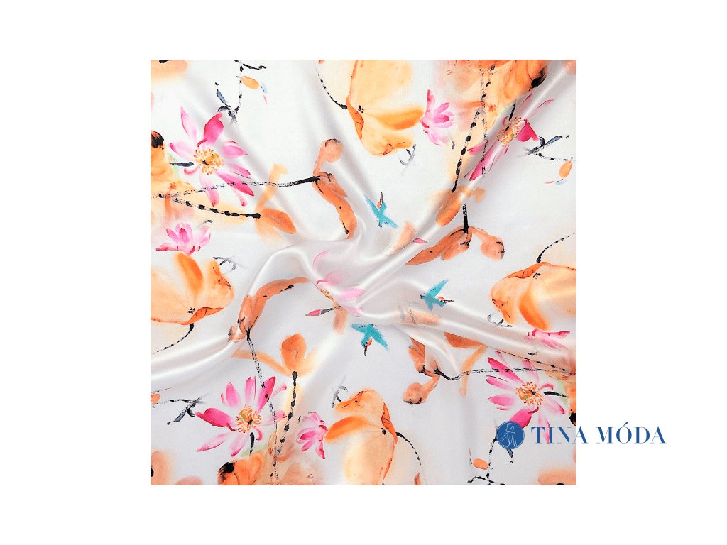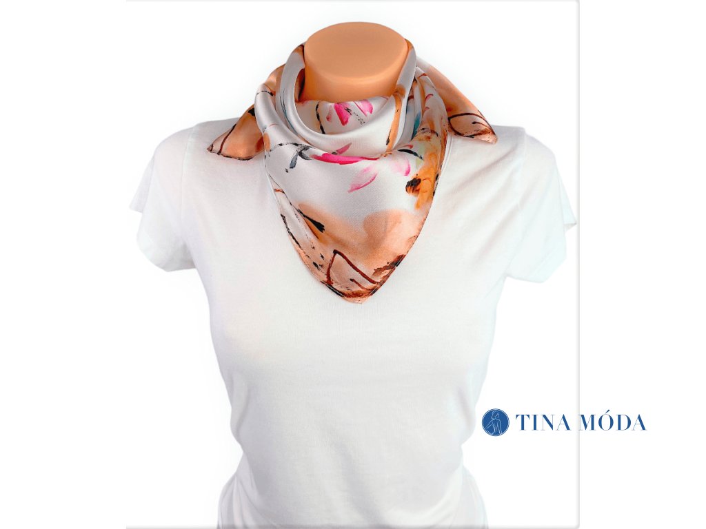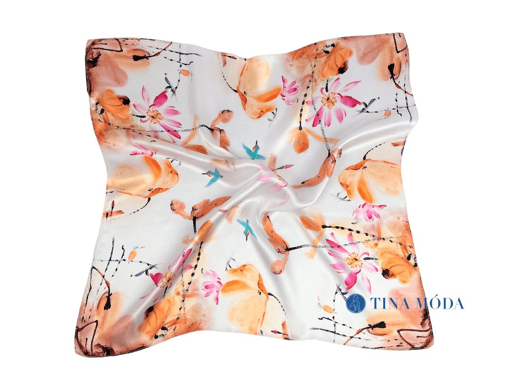 Malý letuškový hedvábný šátek bílý, růžové a oranžové květy, kolibřík, 50 cm 100% hedvábí