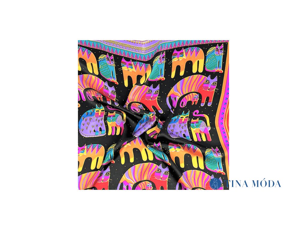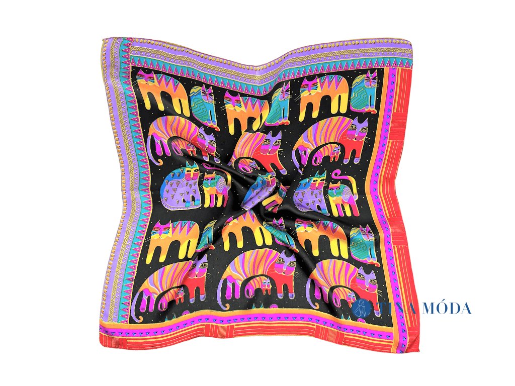 Elegantní šátek s pestrobarevným vzorem koček. Černý podklad nechá vyniknout barevné kombinaci s kočkami a koťátky.