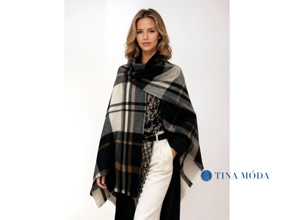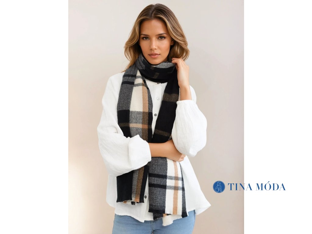 Jemná a měkká černá šála v kombinaci s šedou, hnědou a bílou. Nepravidelný kostkovaný vzor, využijete na denní nošení ke kabátu i bundě na procházky ve dvou nebo se psem. Oviňte se hřejivostí vlny a už vám nebude foukat na krk. Materiál je příjemný na kůži, měkký - nekouše. Praní viz. etiketa údržby.