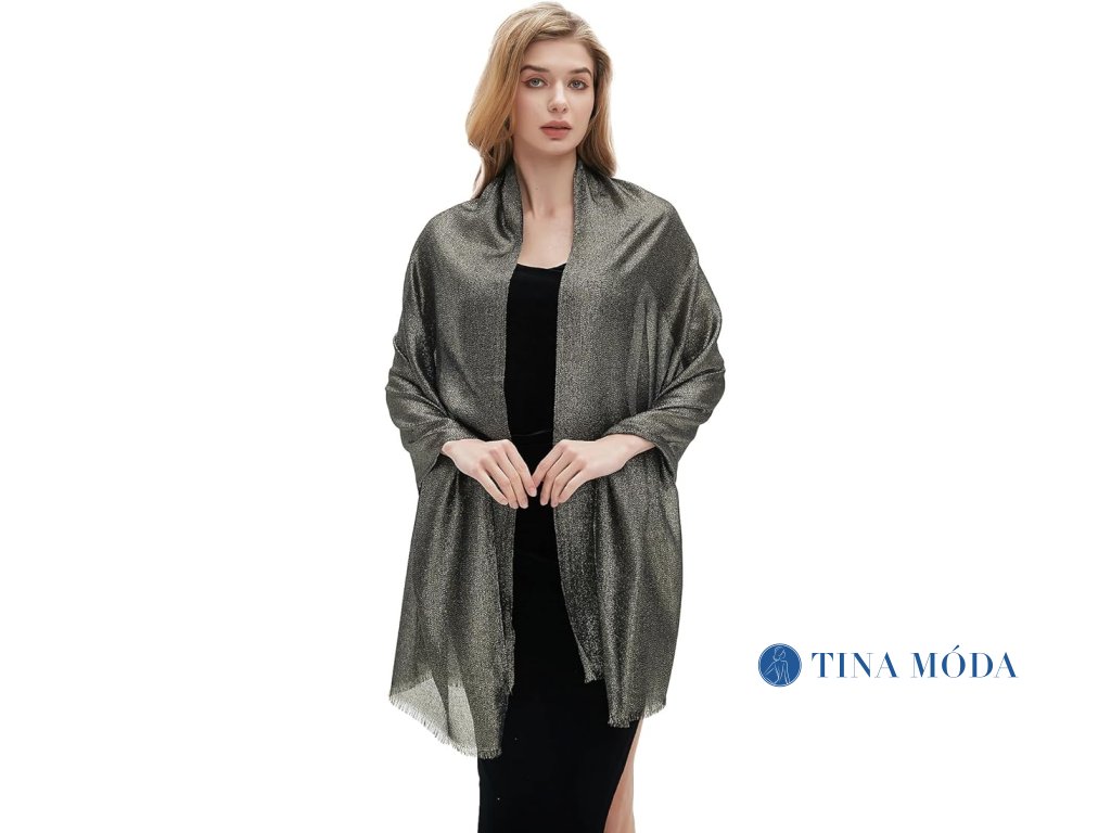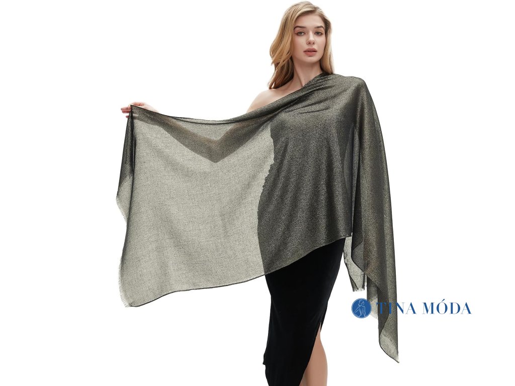 Společenská černá šála se zlatým metalickým vláknem, pléd přes šaty, štola na party do divadla