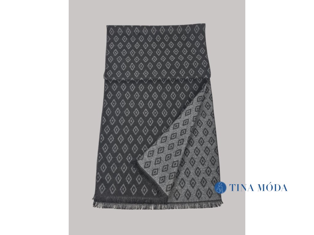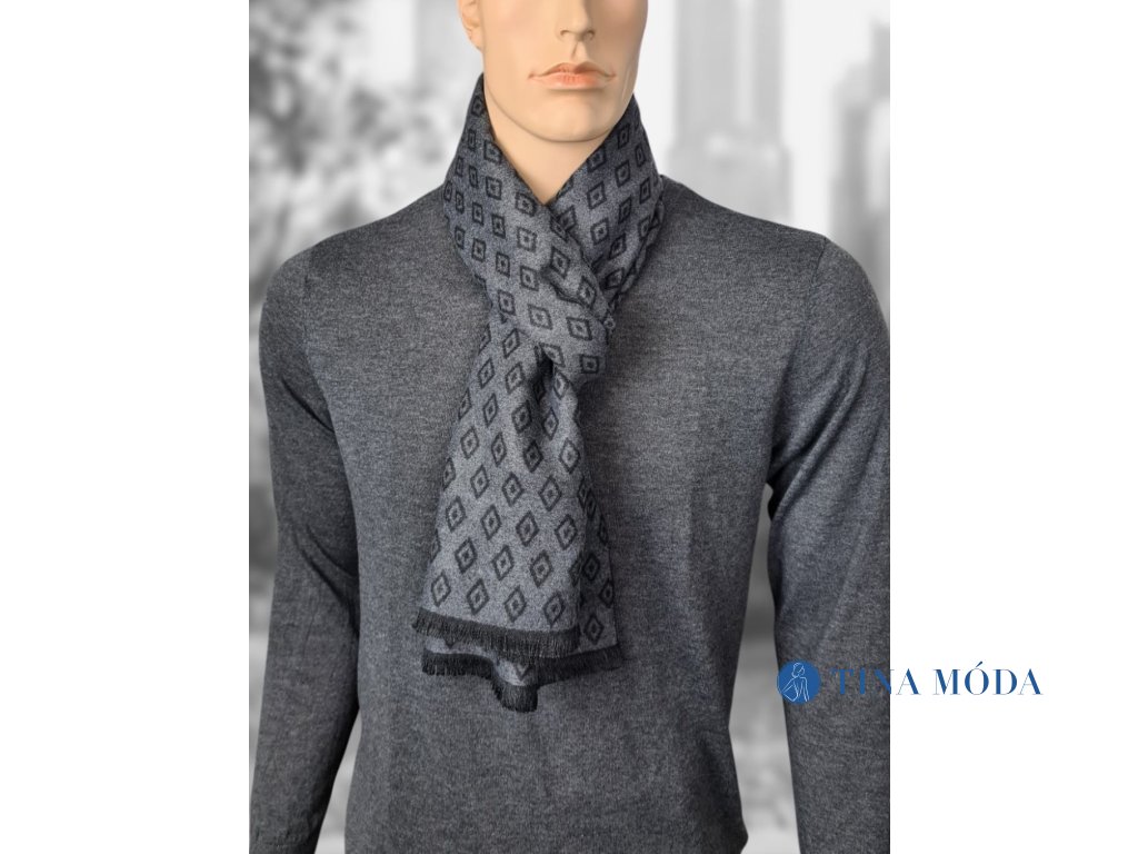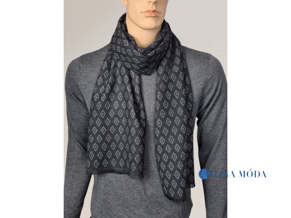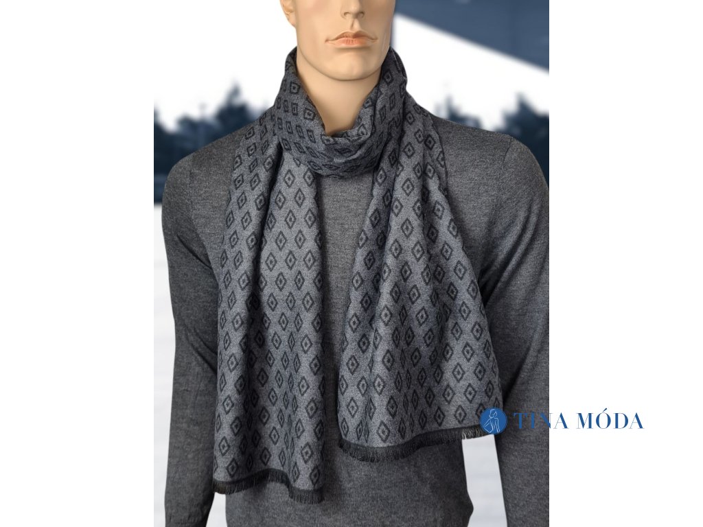 Elegantní jemná pánská šála v černé a šedé barvě s decentním a pravidelným geometrickým vzorem. Zahalte se při sychravém počasí, vyneste na procházku městem s přítelkyní nebo do práce, zahřeje vás.
