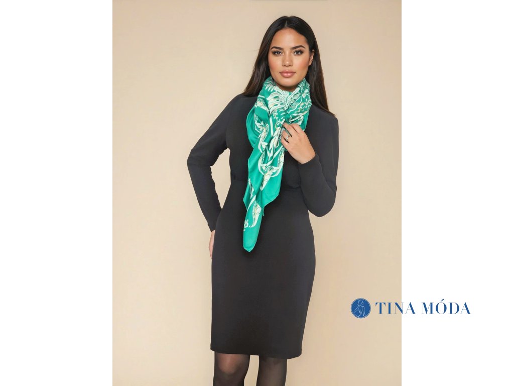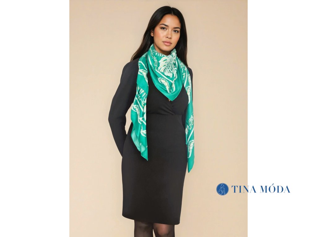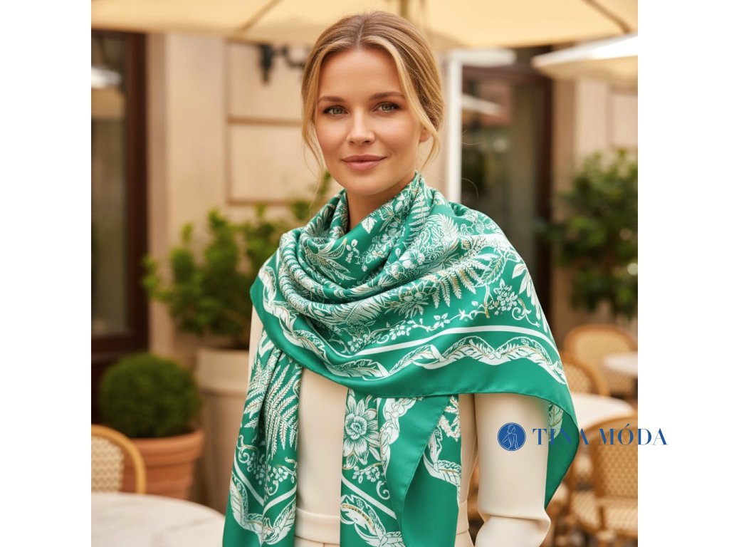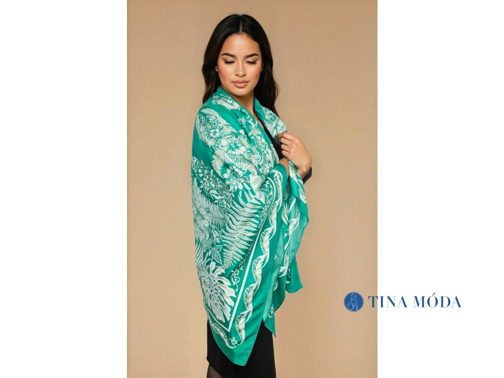 Sytě zelený šátek můžete uvázat kolem krku nebo přes boky, je zdoben vzorem bílých květů a lístky květin zdobí zlatá linka. Se šátkem můžete kouzlit v podobě různorodých možností vázání. Šátek s vyšší gramáží a s jemným polosaténovým leskem.