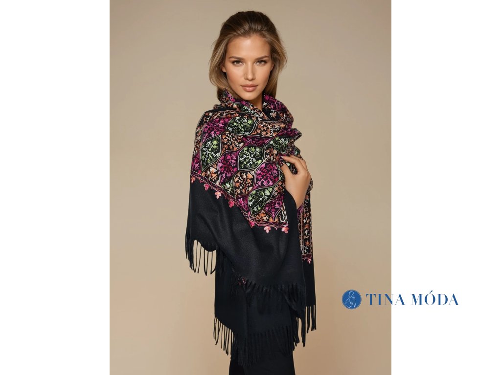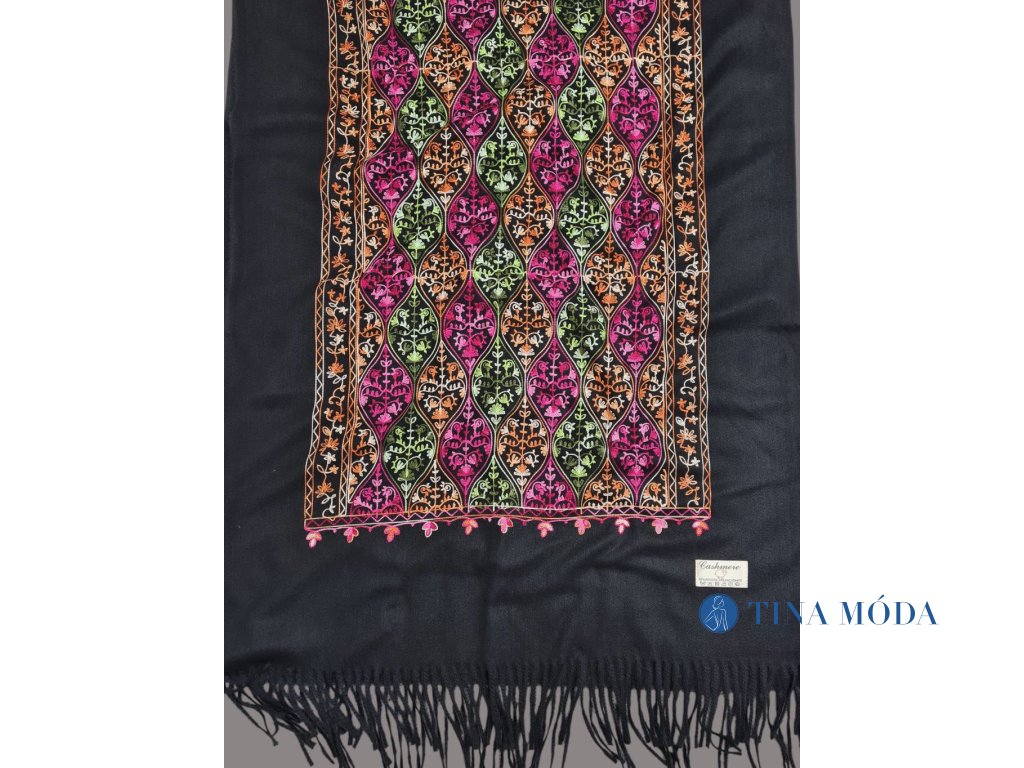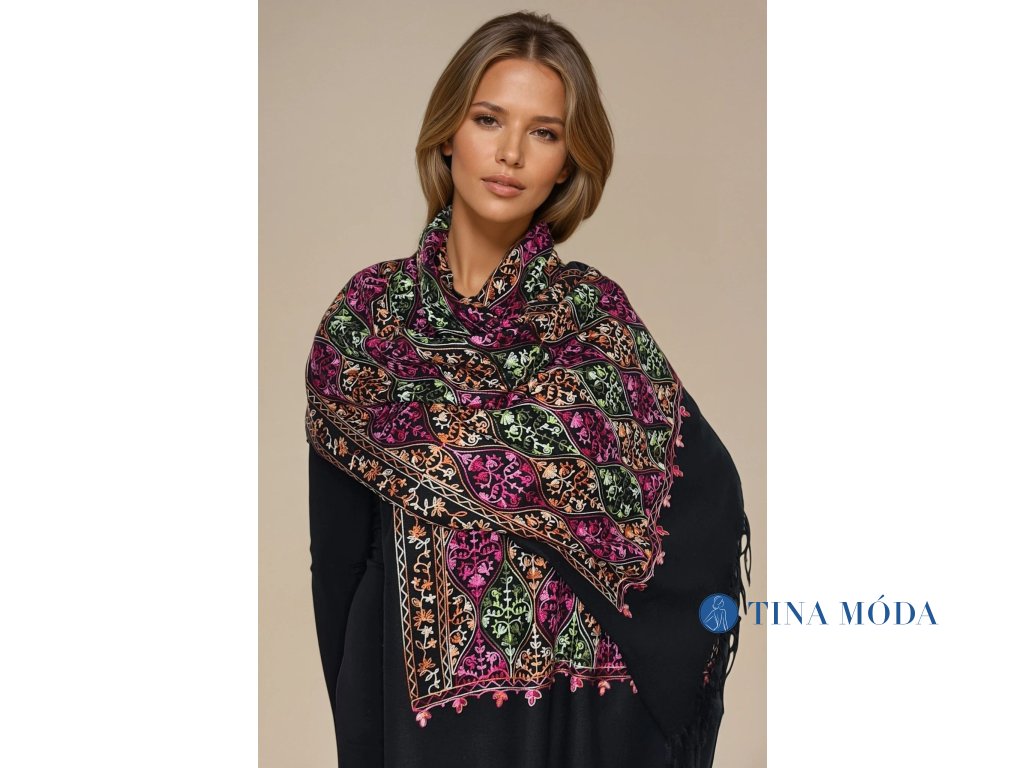 Vyšívaná kašmírová černá šála s barevnou výšivkou bordurou - pléd