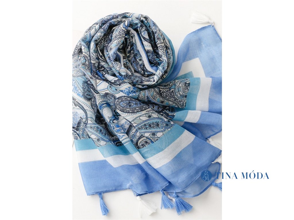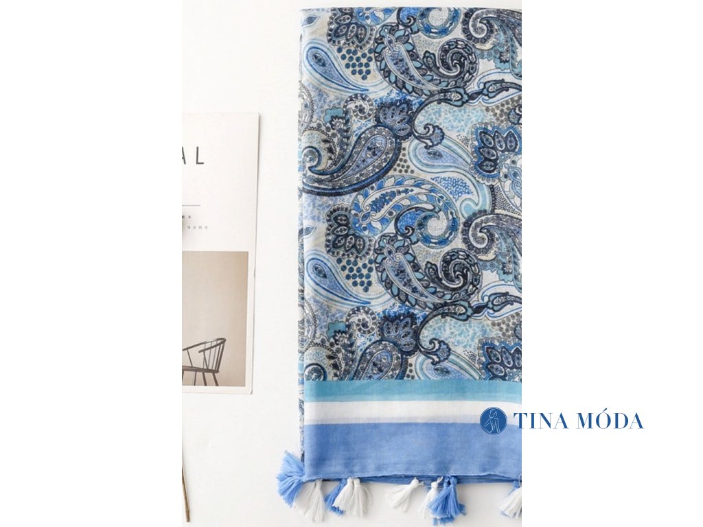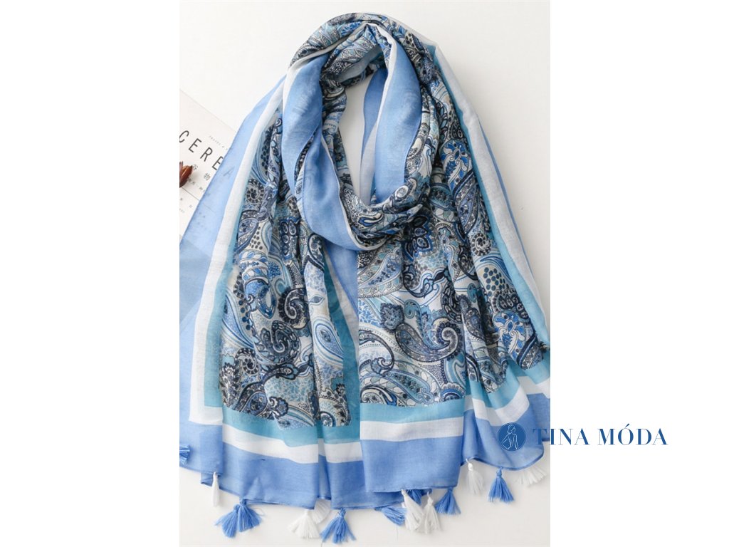 Jemně modrá letní šála s ozdobnými třapci. Vzor paisley v modrých tónech, linky jako lem. Studené barvy. Měkký materiál v letních barvách. Vzorovanou šálu můžete nakombinovat k šatům, kabátu i přes plavky. Lehce uvázat kolem krku, nosit jako pléd, pareo nebo přehoz přes ramena na šaty... libovolně. Materiál je příjemný na kůži. Praní viz. etiketa údržby.